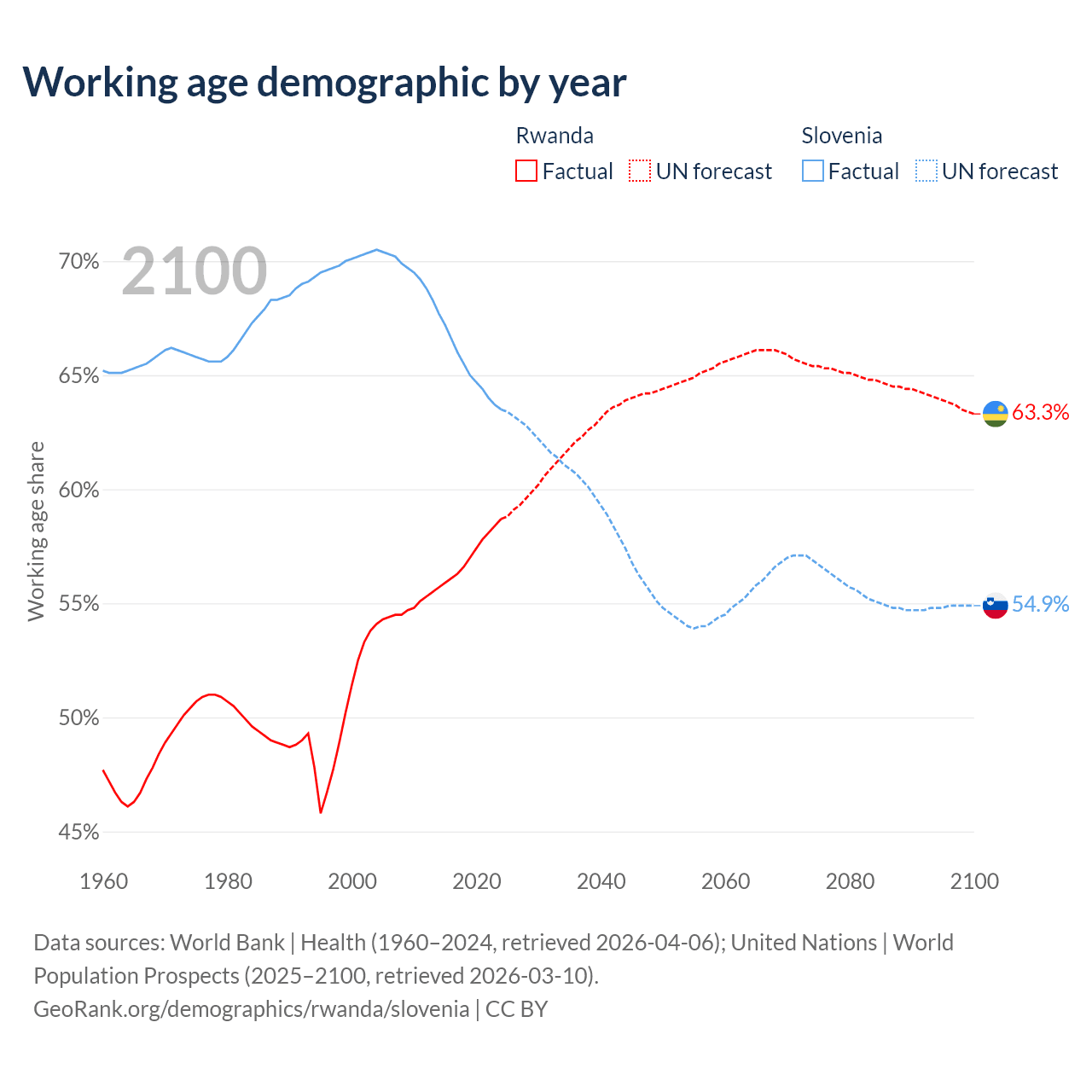 - Rwanda has 8.79M working age adults (aged 15-64) vs 1.35M in Slovenia.