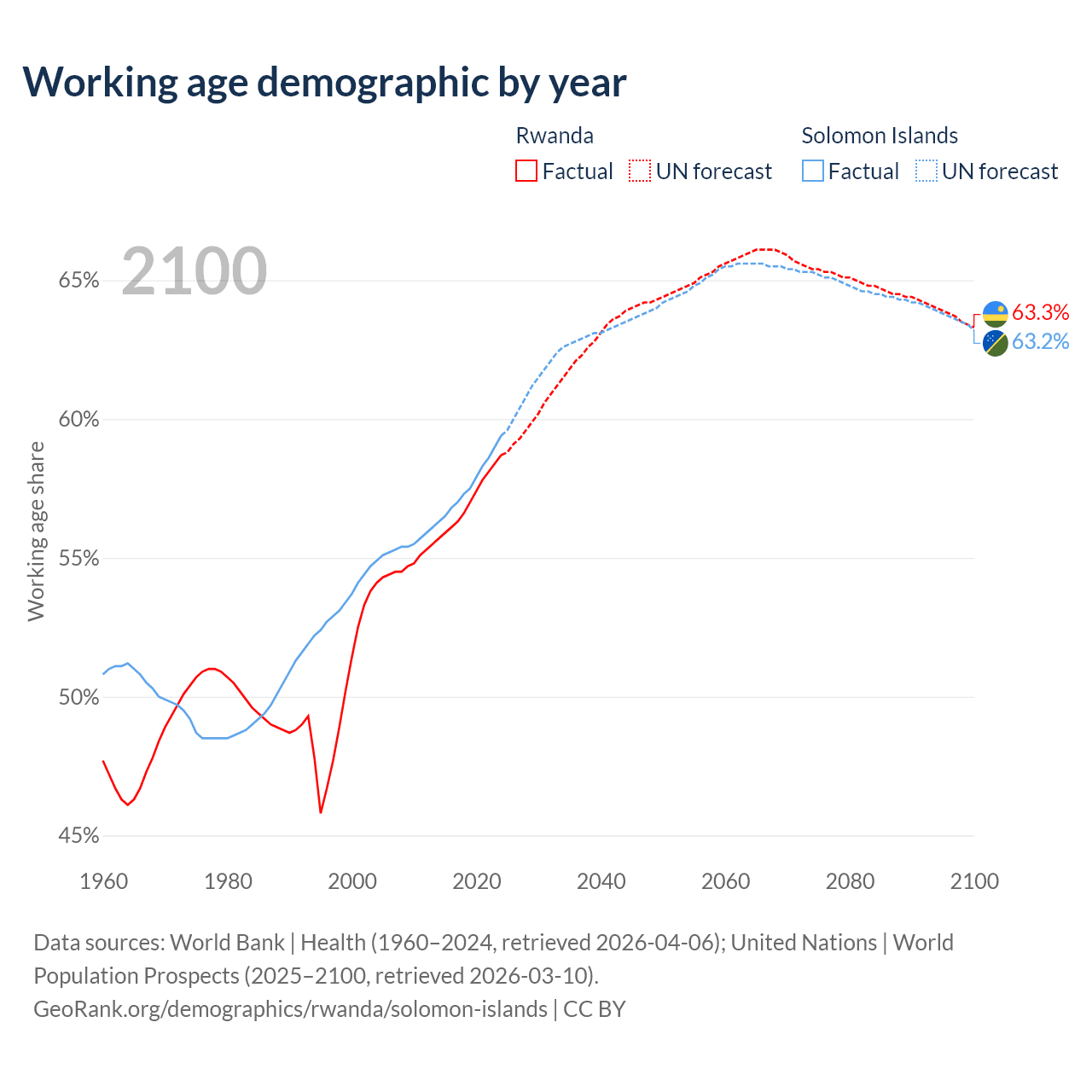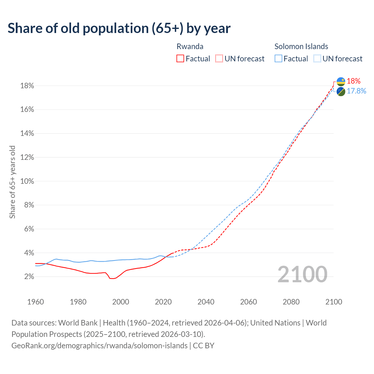 The share of older people aged 65 and over is 3.93% in Rwanda and 3.64% in the Solomon Islands. Life expectancy in Rwanda compared to the Solomon Islands .