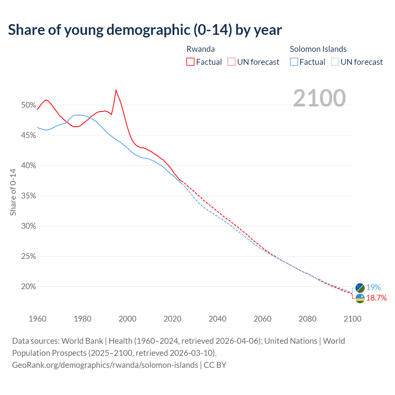 - The share of young demographic (0-15 years old) in Rwanda is 37.4% vs 37% in the Solomon Islands.