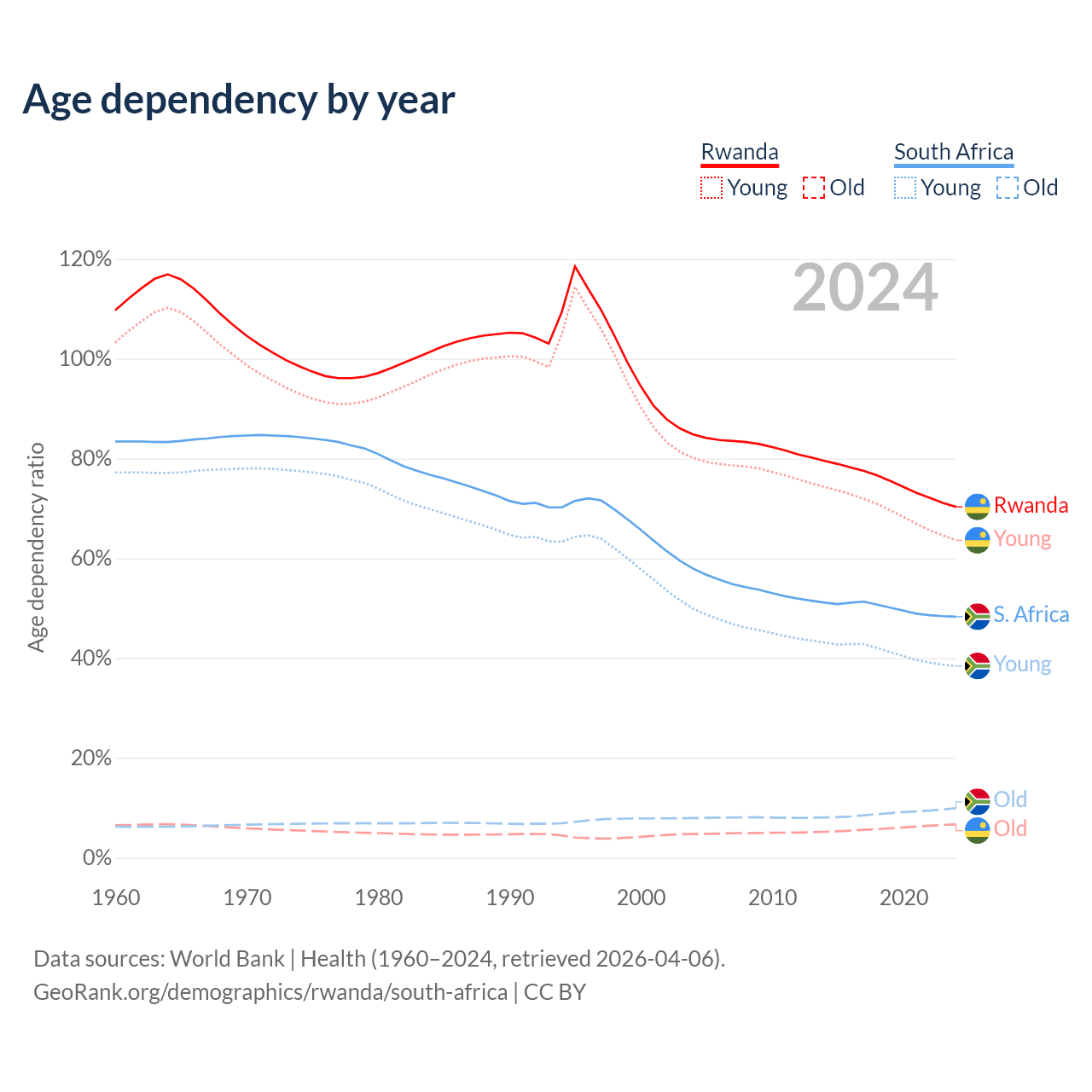 The share of older people aged 65 and over is 3.93% in Rwanda and 6.69% in South Africa. Life expectancy in Rwanda compared to South Africa .