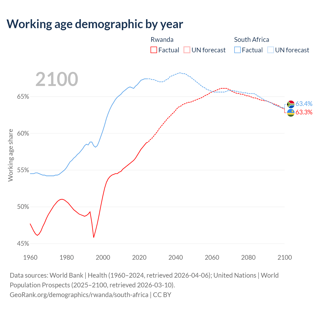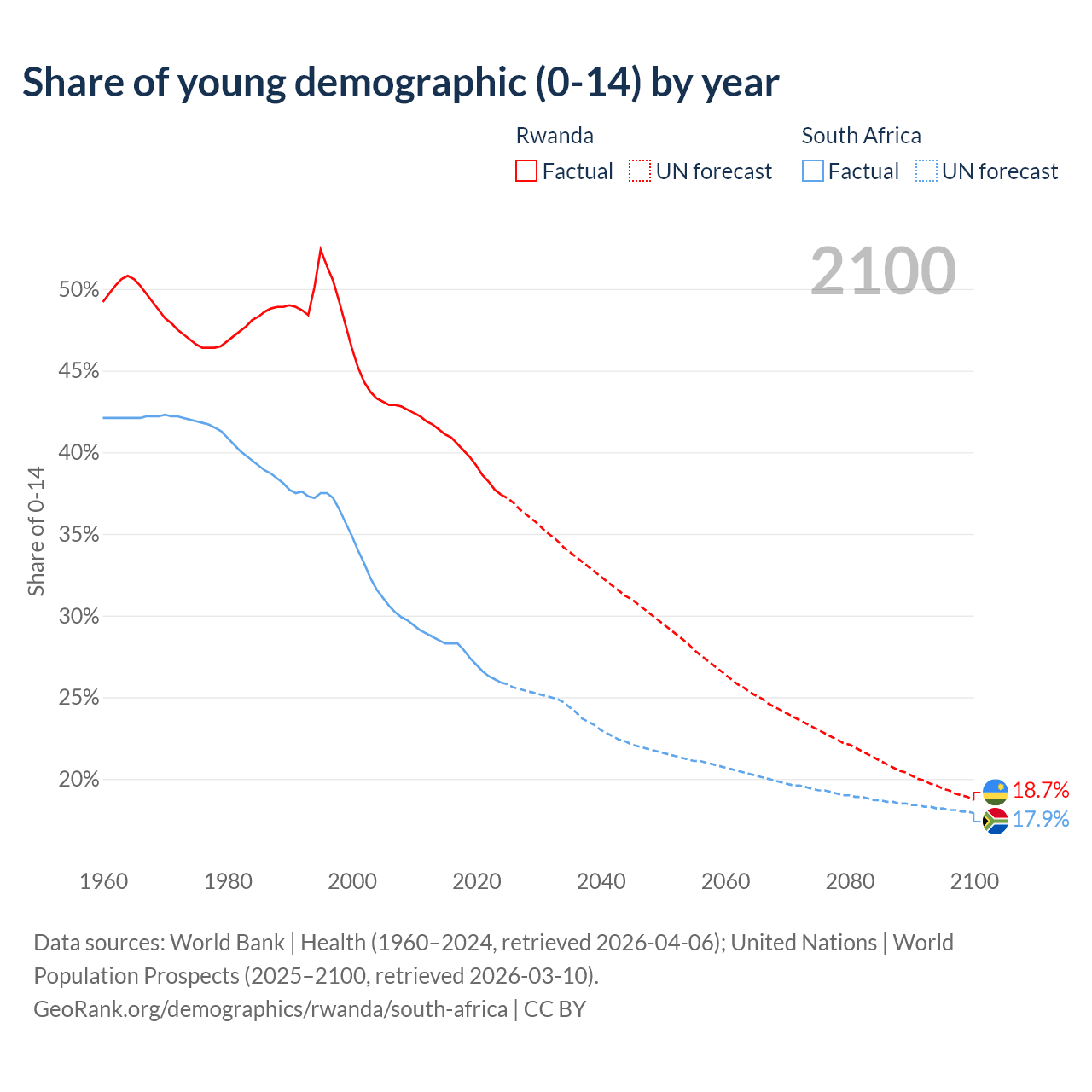 Median age Rwanda vs South Africa, 1960-2100