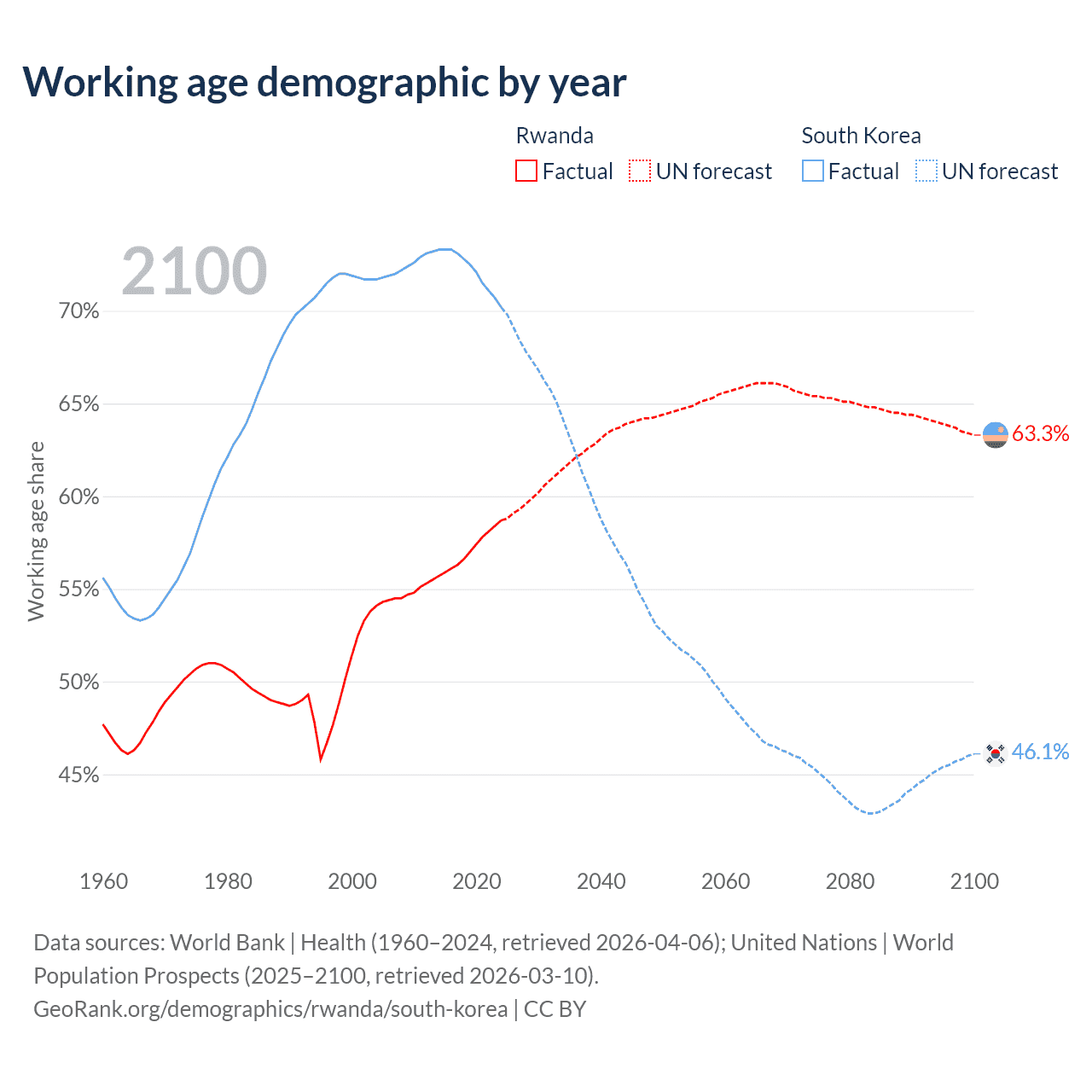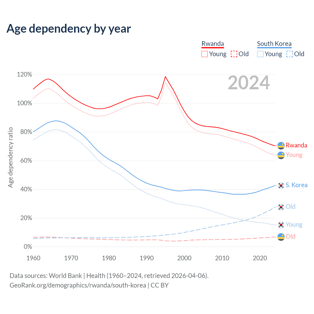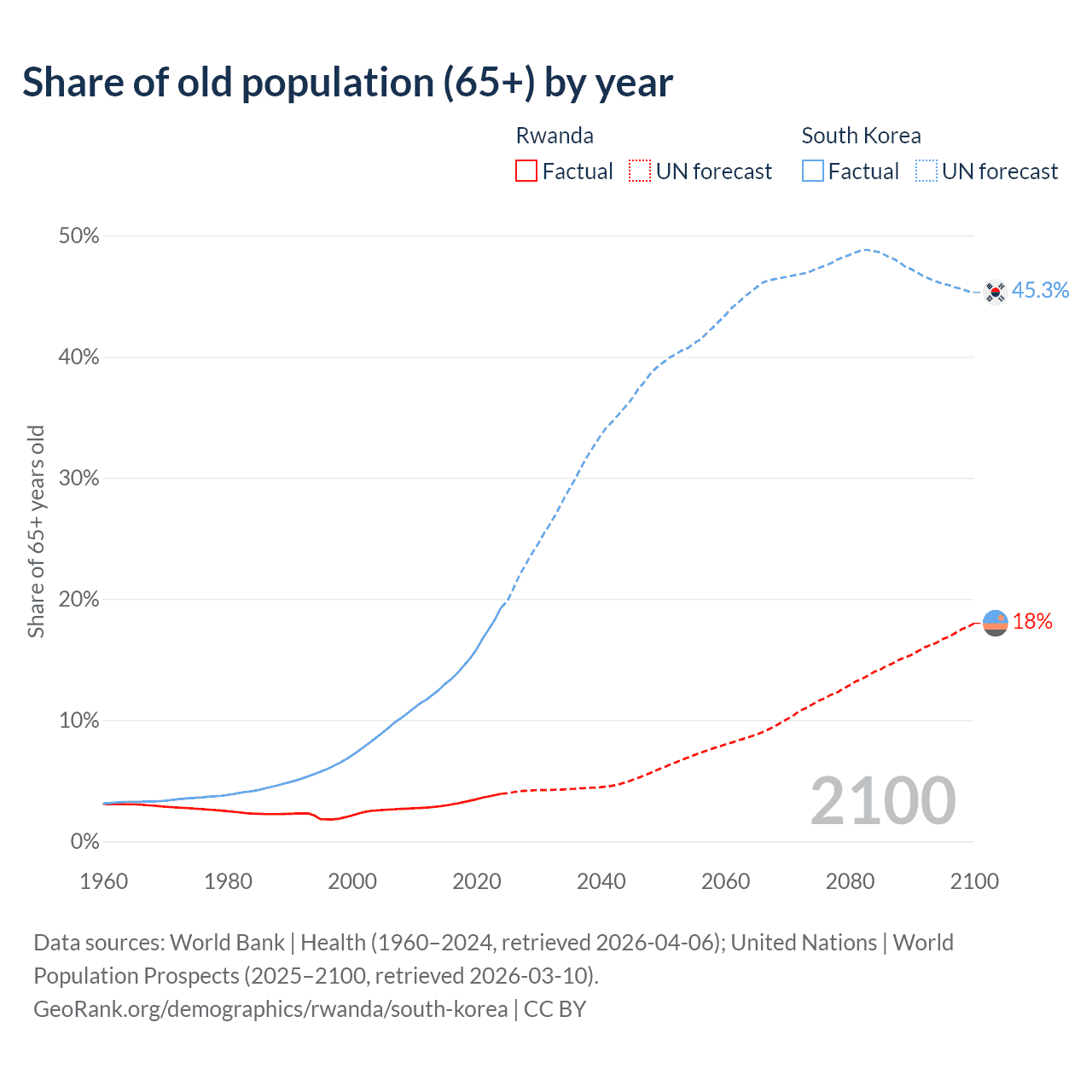 The share of older people aged 65 and over is 3.93% in Rwanda and 19.3% in South Korea. Life expectancy in Rwanda compared to South Korea .