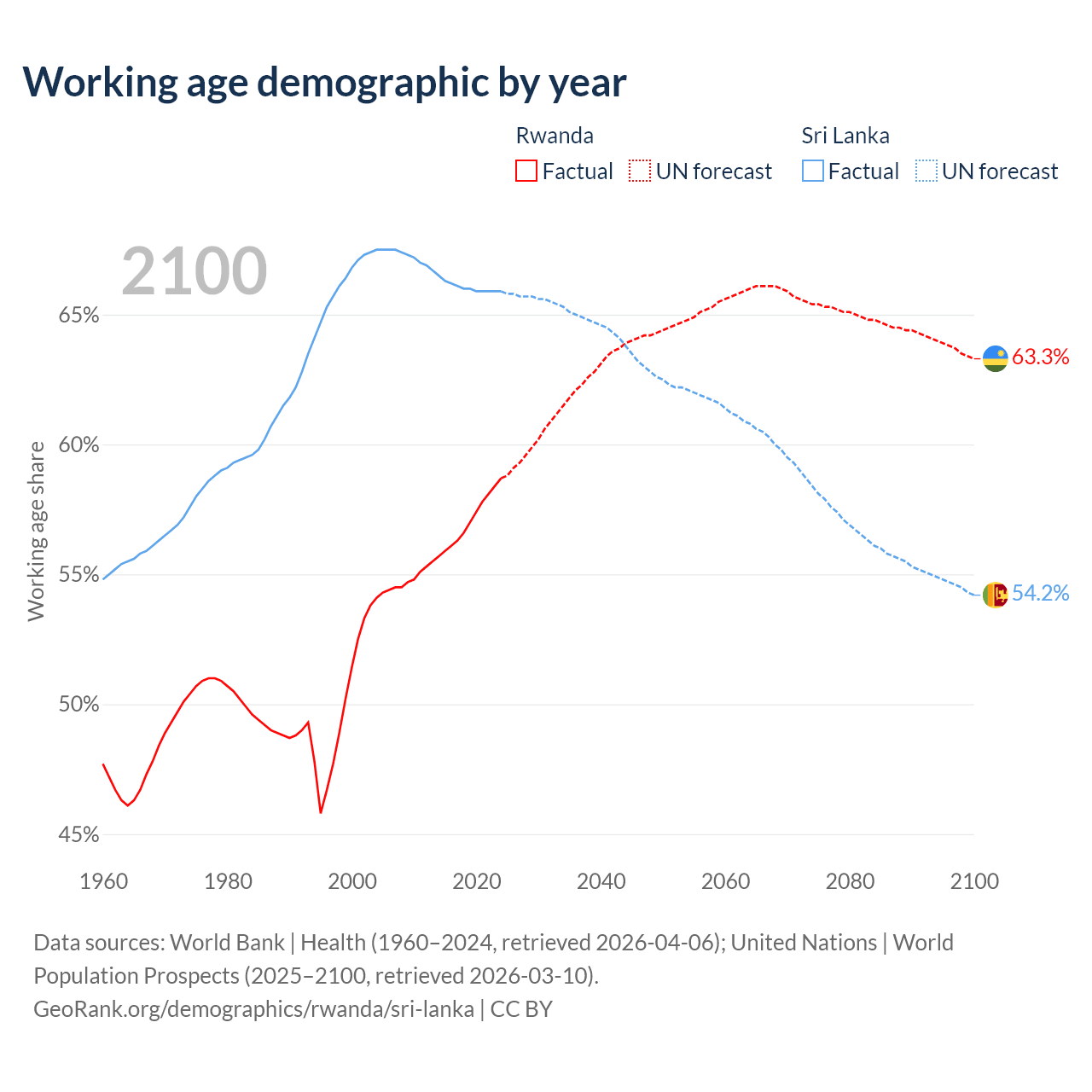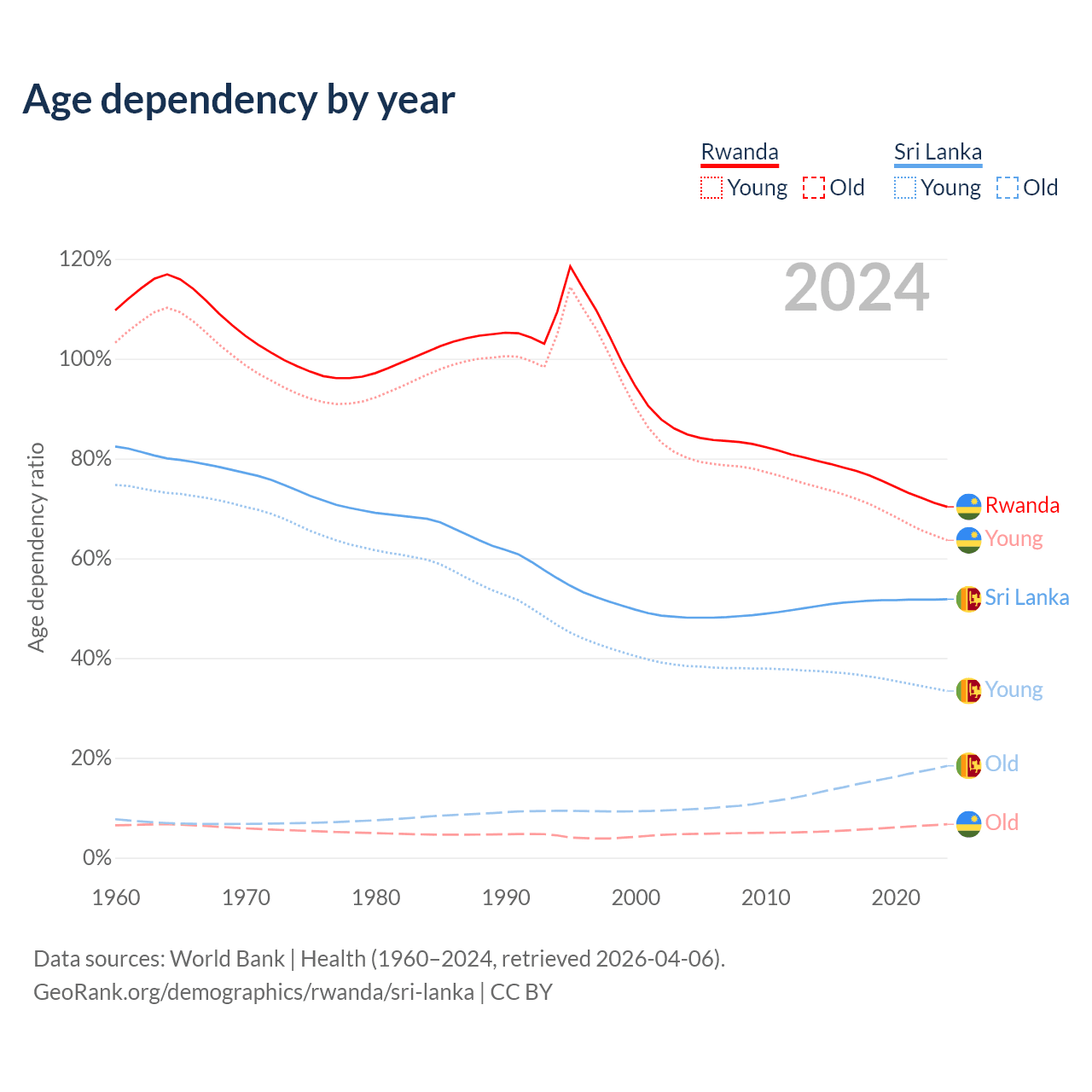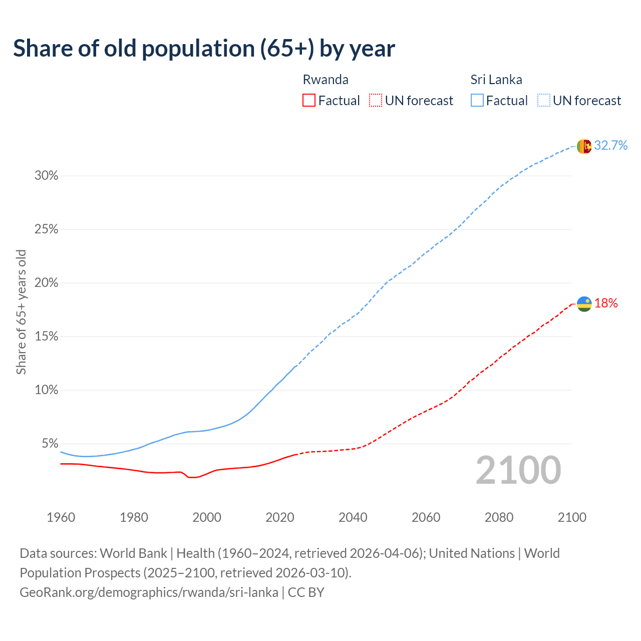 The share of older people aged 65 and over is 3.93% in Rwanda and 12.1% in Sri Lanka. Life expectancy in Rwanda compared to Sri Lanka .