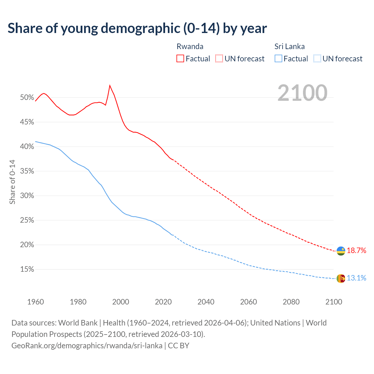 Median age Rwanda vs Sri Lanka, 1960-2100