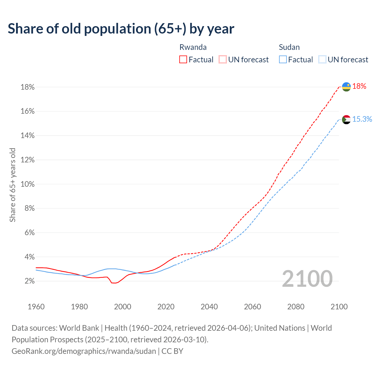 The share of older people aged 65 and over is 3.93% in Rwanda and 3.3% in Sudan. Life expectancy in Rwanda compared to Sudan .