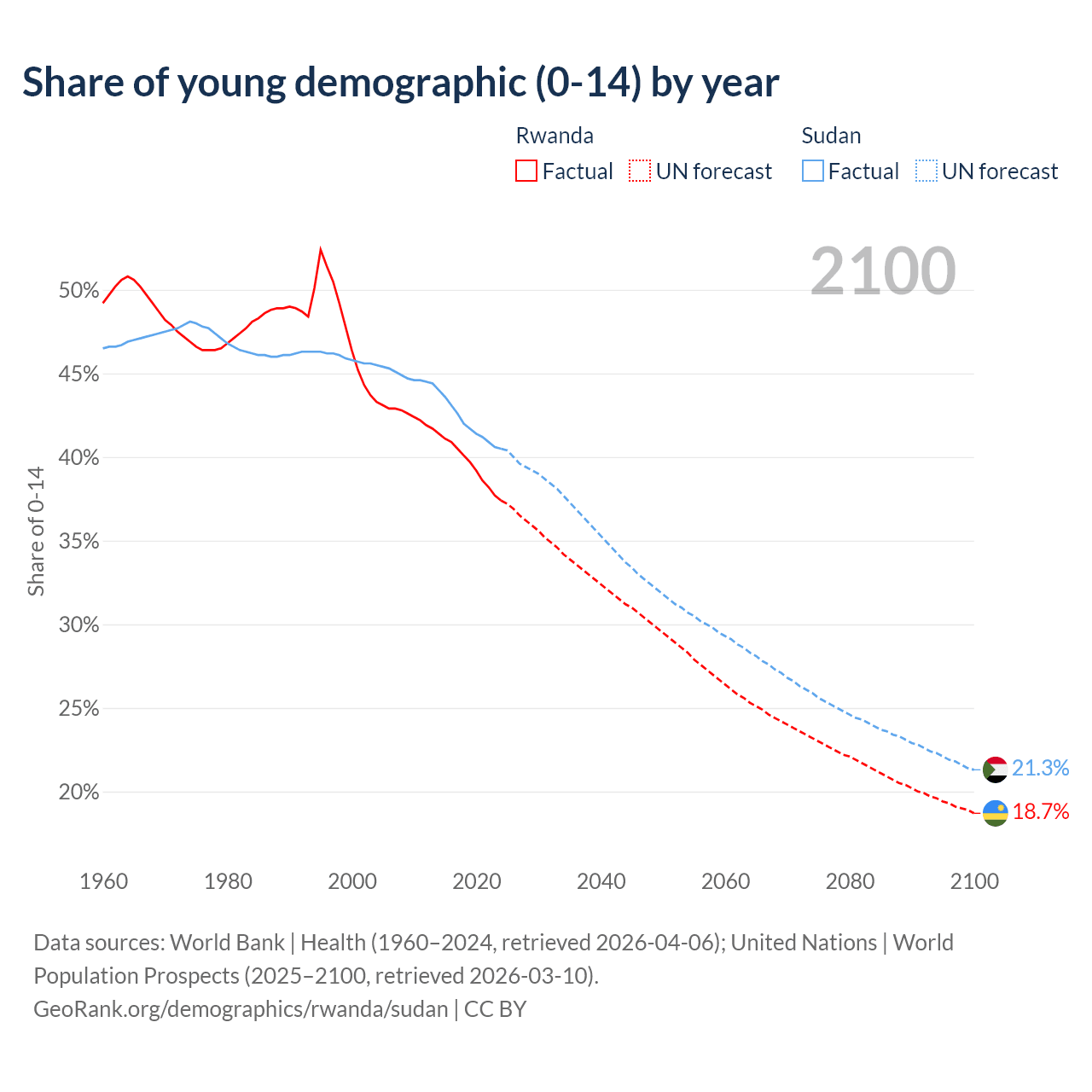 Median age Rwanda vs Sudan, 1960-2100