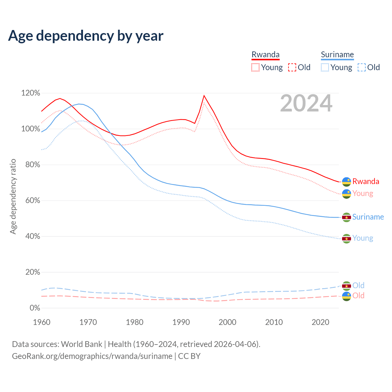 The share of older people aged 65 and over is 3.93% in Rwanda and 7.9% in Suriname. Life expectancy in Rwanda compared to Suriname .