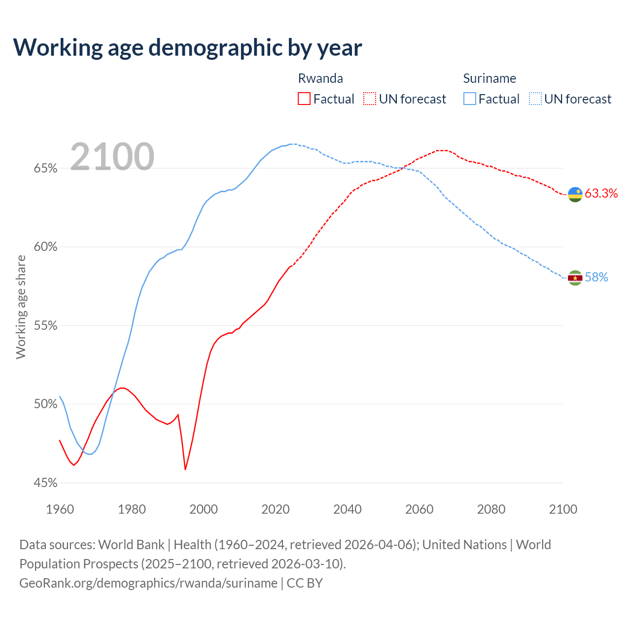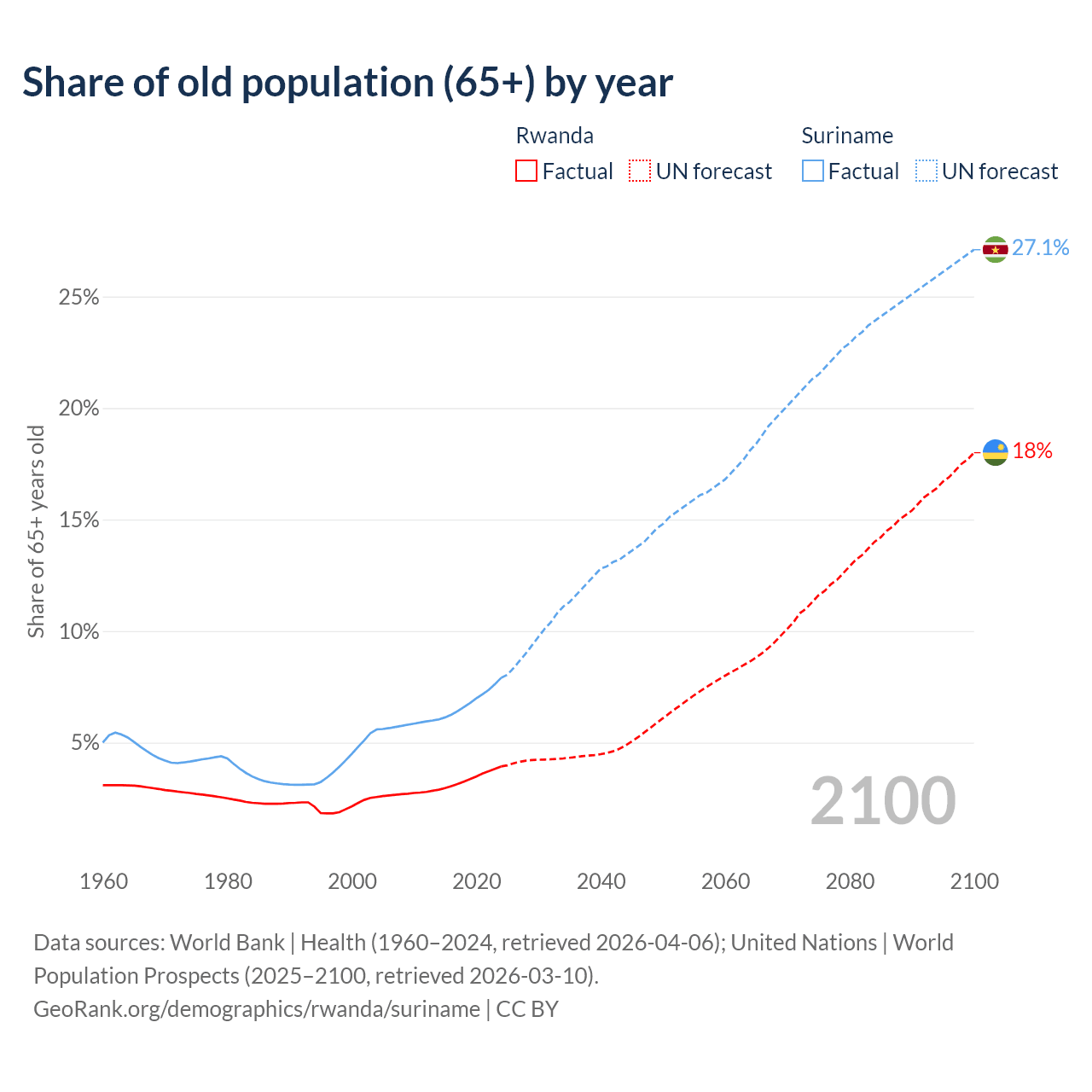 - The share of old-age demographic (65+) in Rwanda is 3.93% vs 7.9% in Suriname.