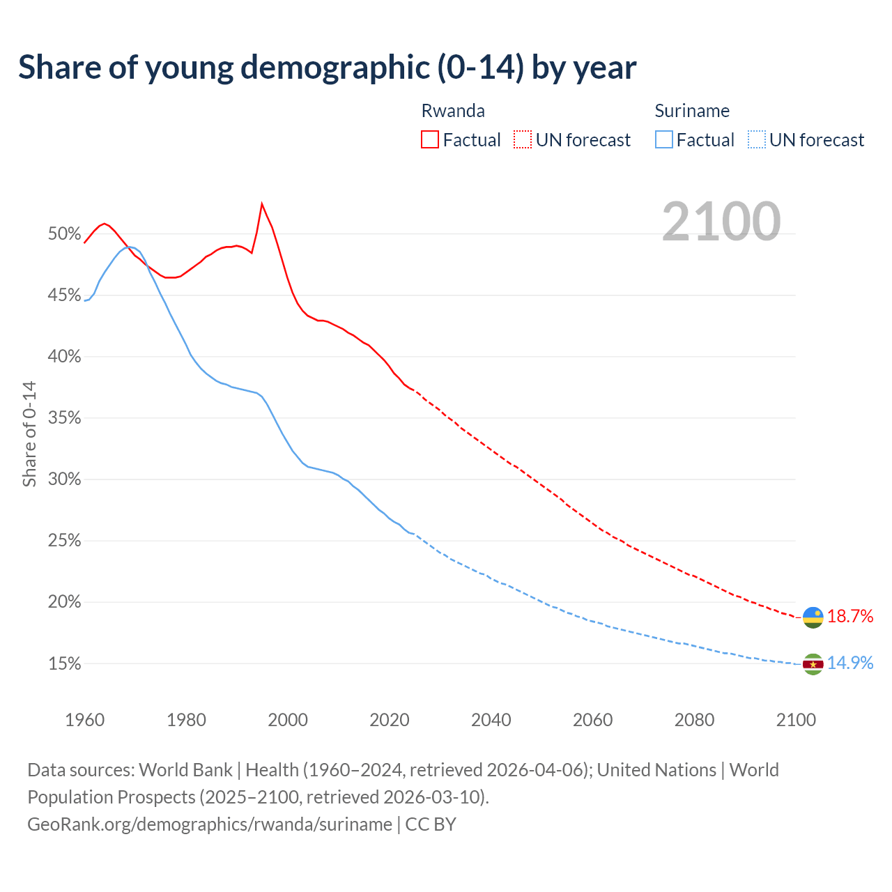 - The share of young demographic (0-15 years old) in Rwanda is 37.4% vs 25.6% in Suriname.