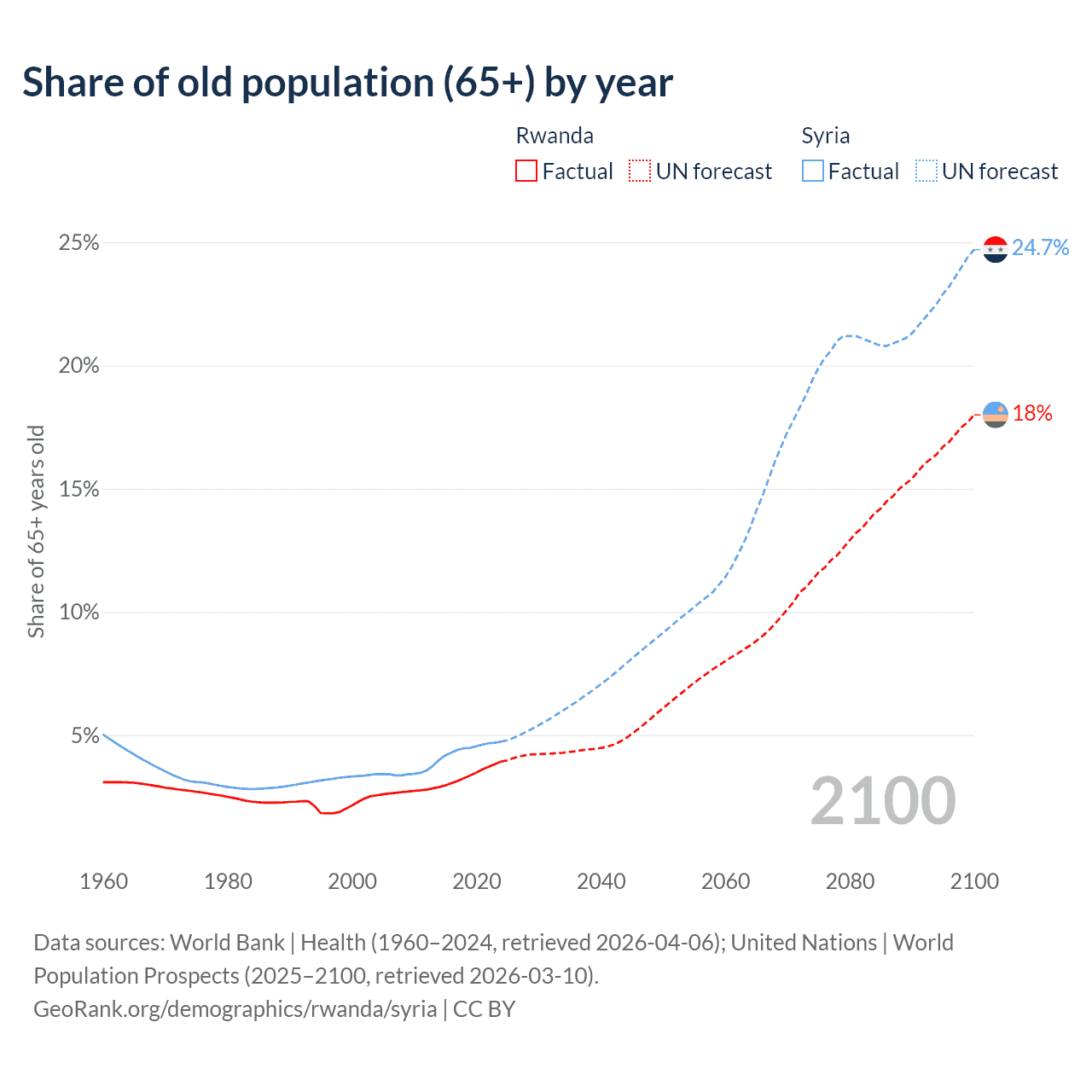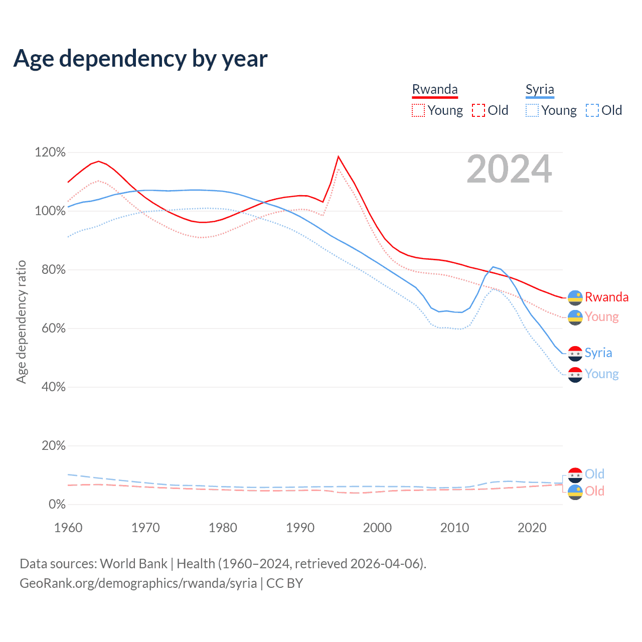 - The share of old-age demographic (65+) in Rwanda is 3.93% vs 4.74% in Syria.