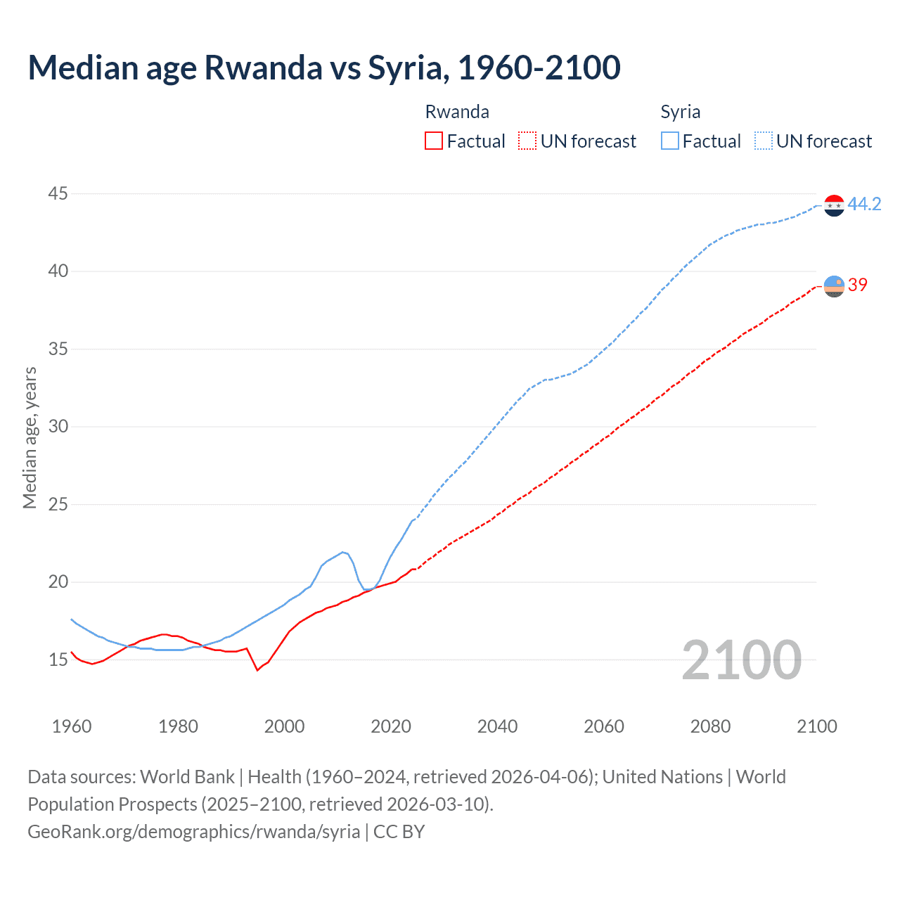 - Rwanda is ranked 160/196 by median age (oldest to youngest) vs 138/196 for Syria.