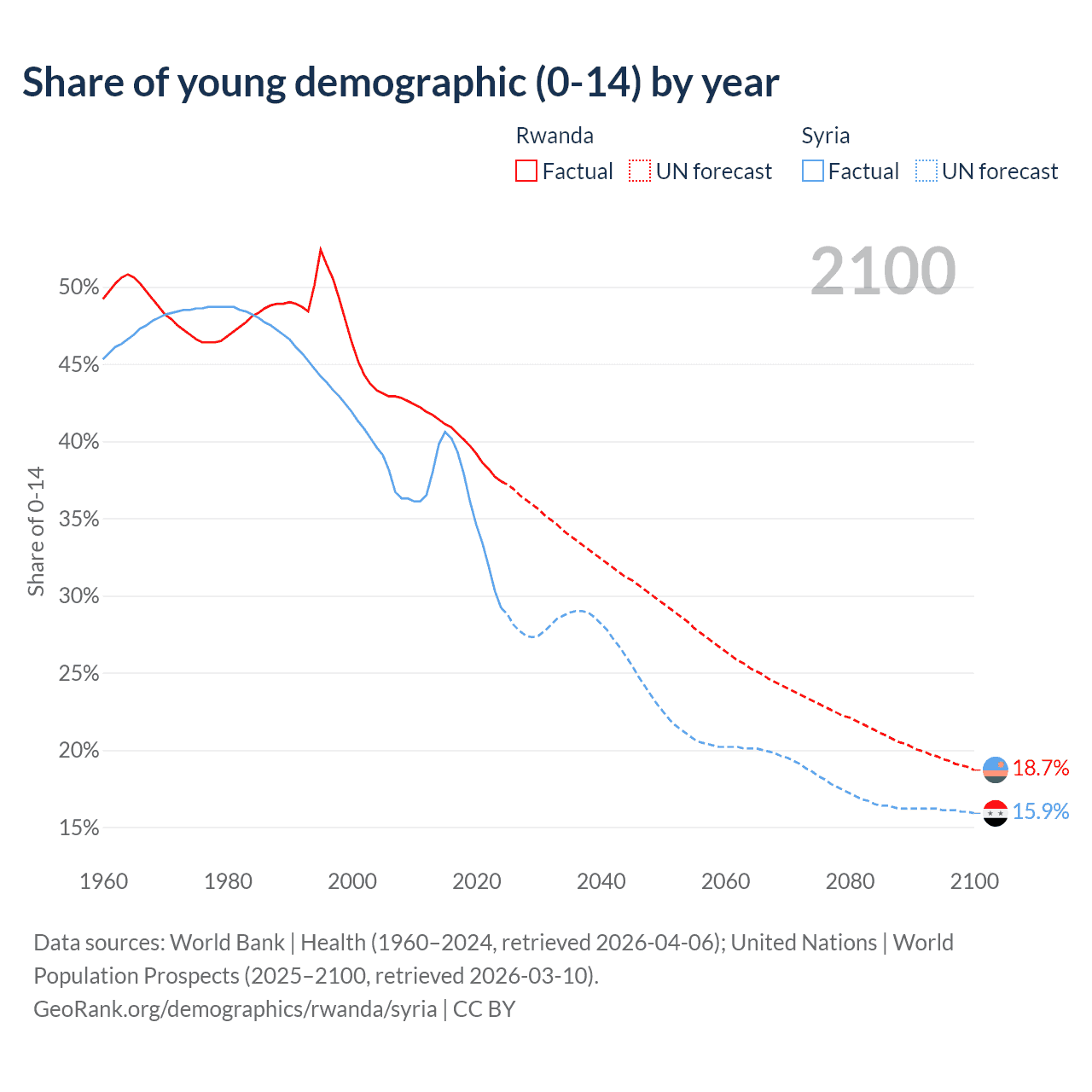 - The share of young demographic (0-15 years old) in Rwanda is 37.4% vs 29.2% in Syria.