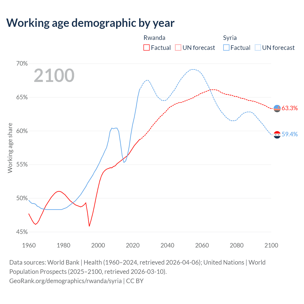 - Rwanda has 8.79M working age adults (aged 15-64) vs 17.7M in Syria.