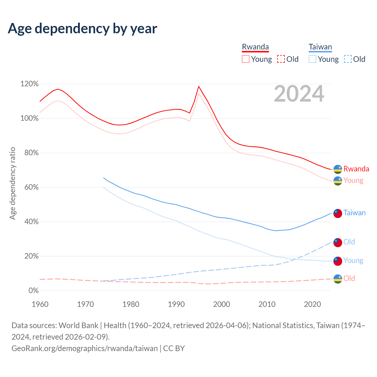 Data sources: World Bank | Health (1960–2024, retrieved 2026-04-06); U.S. Census Bureau (1960–2024, retrieved 2026-02-08); National Statistics, Taiwan (1974–2024, retrieved 2026-02-09).