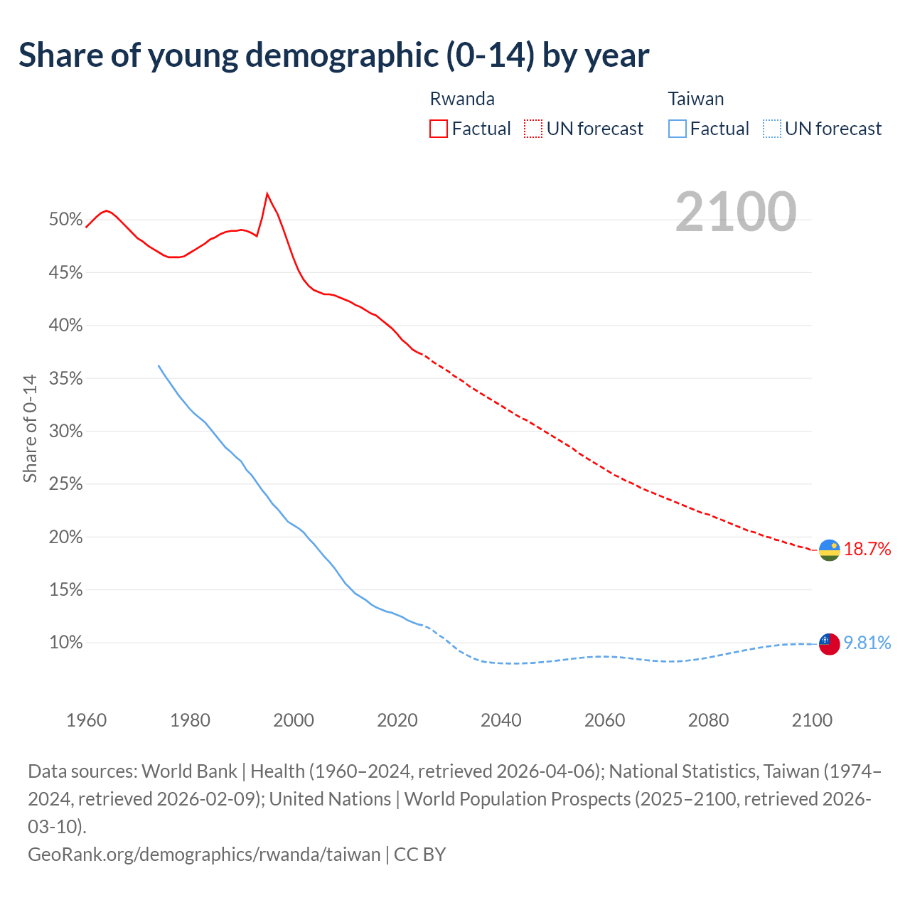 - The share of young demographic (0-15 years old) in Rwanda is 37.4% vs 11.7% in Taiwan.