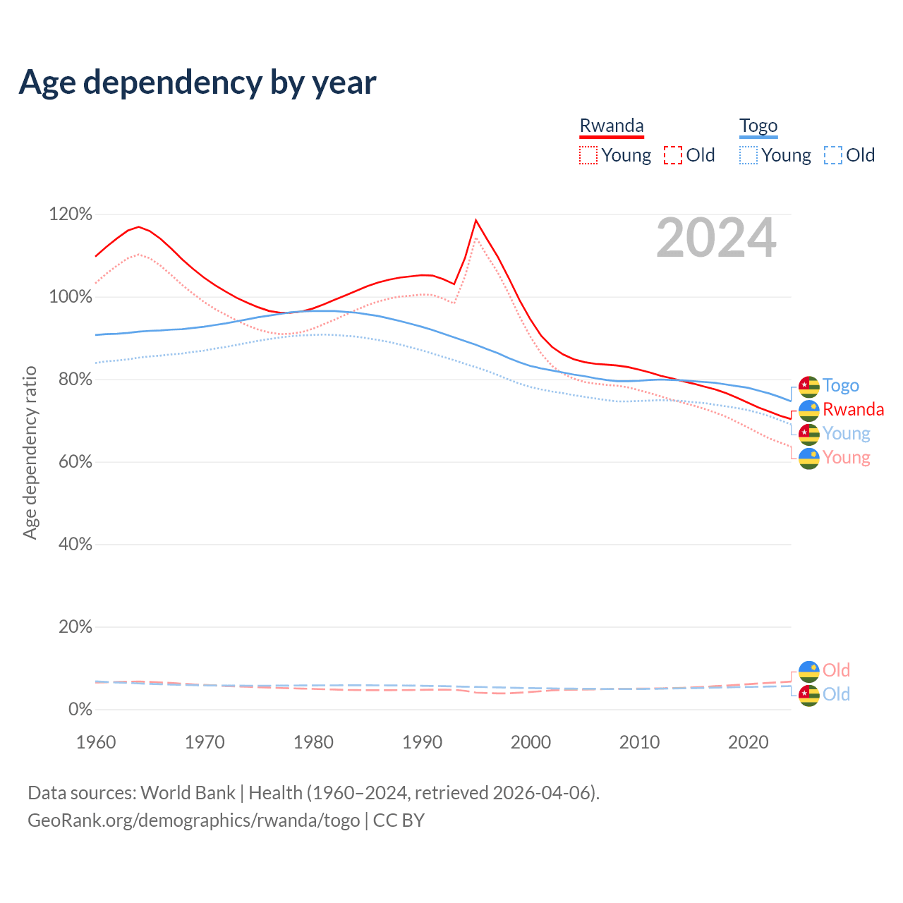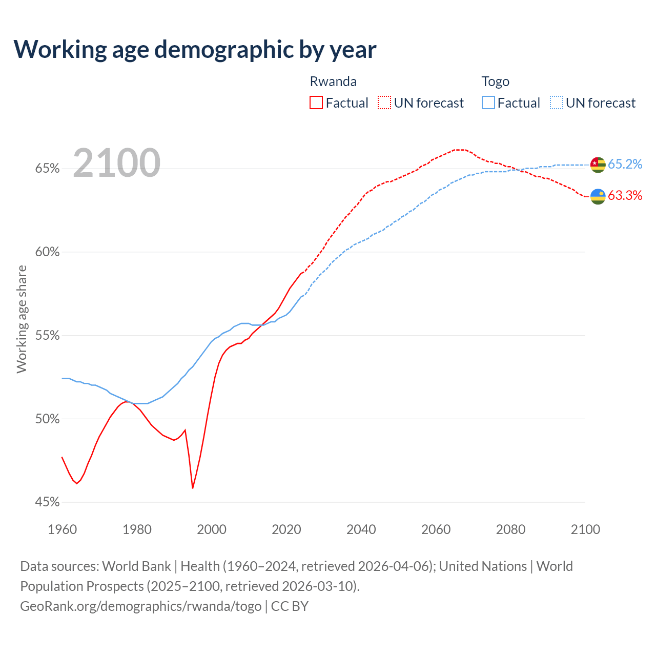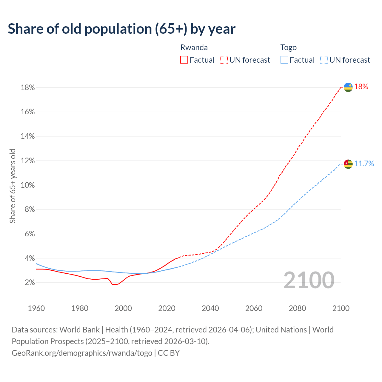 The share of older people aged 65 and over is 3.93% in Rwanda and 3.21% in Togo. Life expectancy in Rwanda compared to Togo .