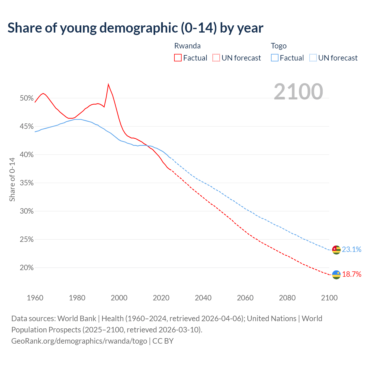 Median age Rwanda vs Togo, 1960-2100