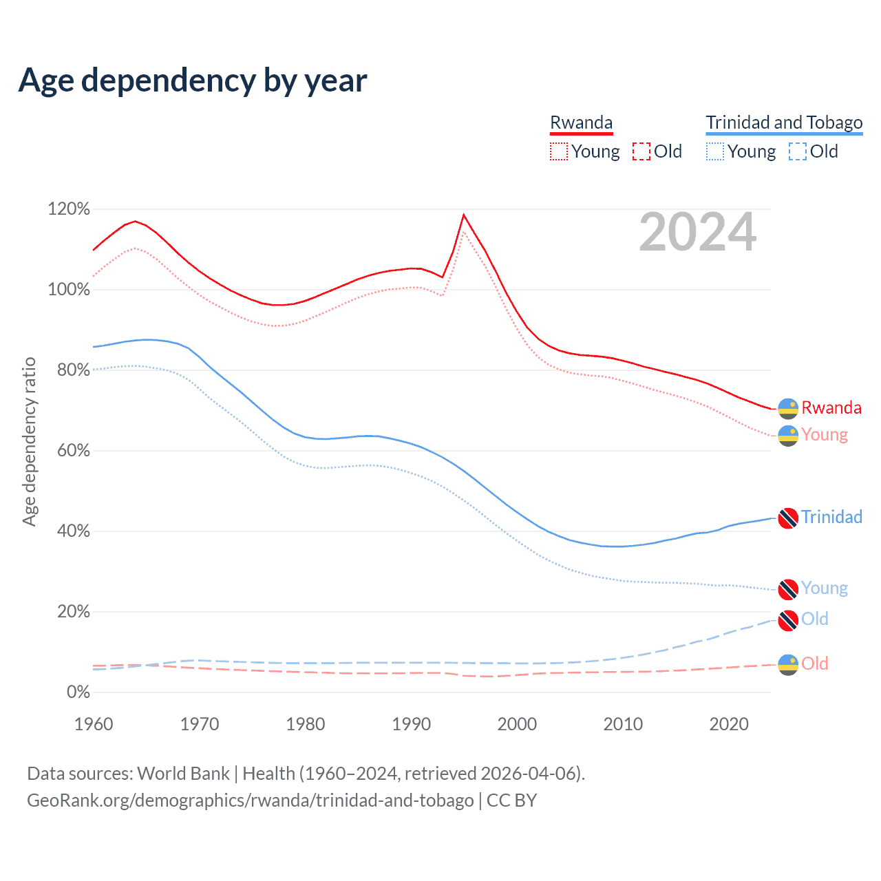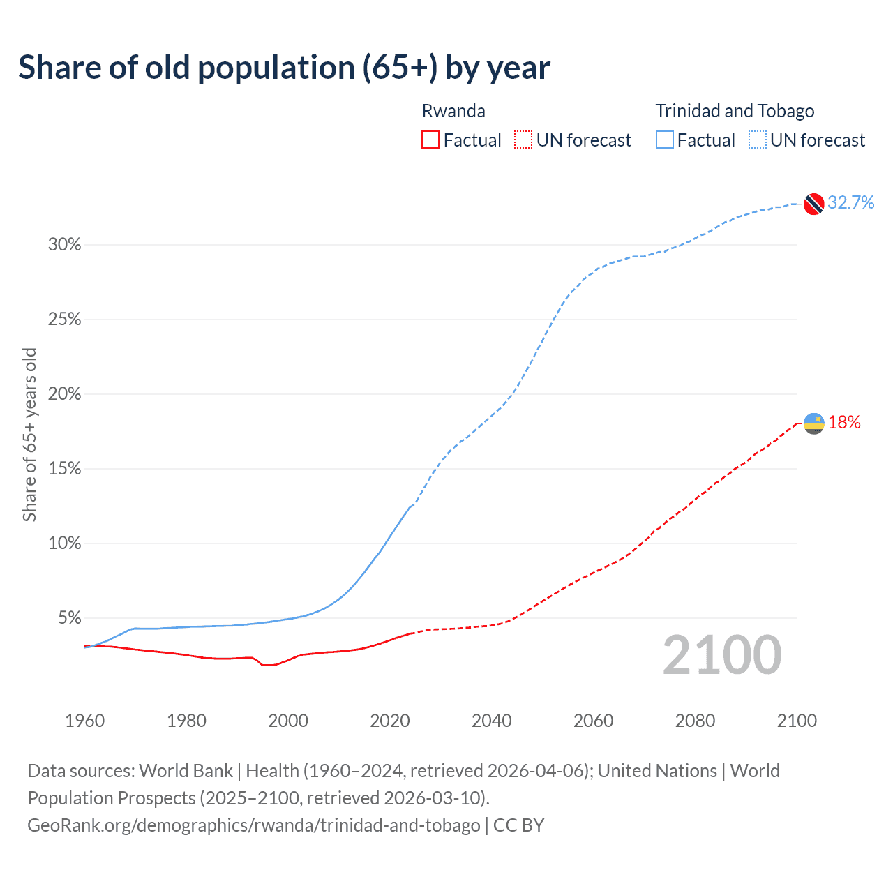 The share of older people aged 65 and over is 3.93% in Rwanda and 12.4% in Trinidad and Tobago. Life expectancy in Rwanda compared to Trinidad and Tobago .