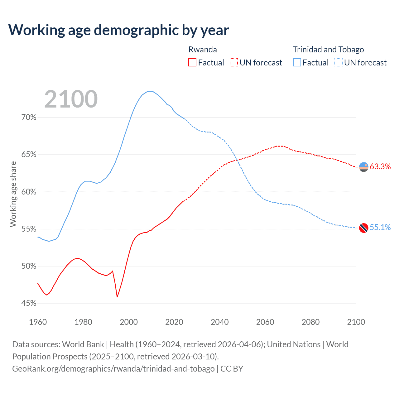 Median age Rwanda vs Trinidad and Tobago, 1960-2100