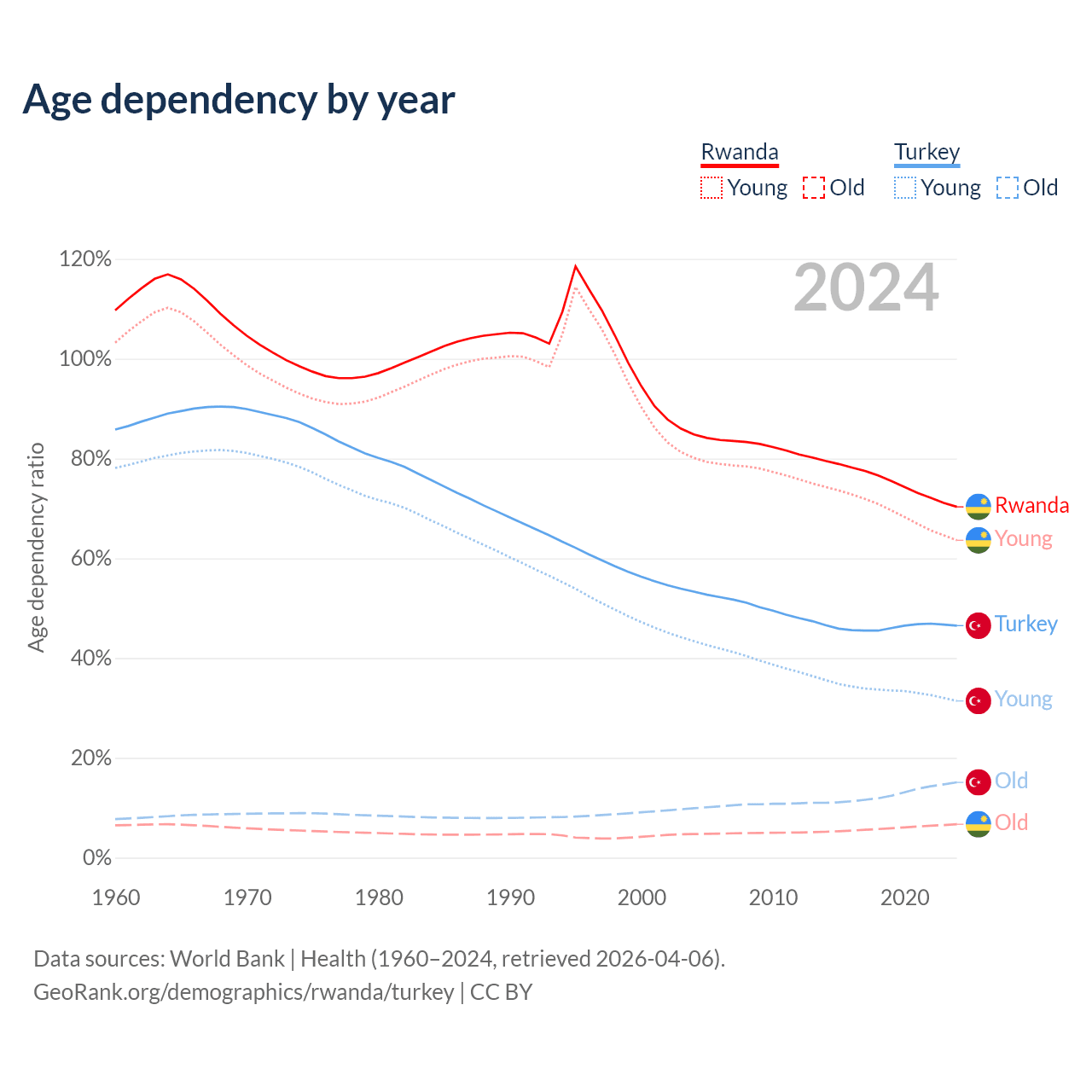 The share of older people aged 65 and over is 3.93% in Rwanda and 10.3% in Turkey. Life expectancy in Rwanda compared to Turkey .