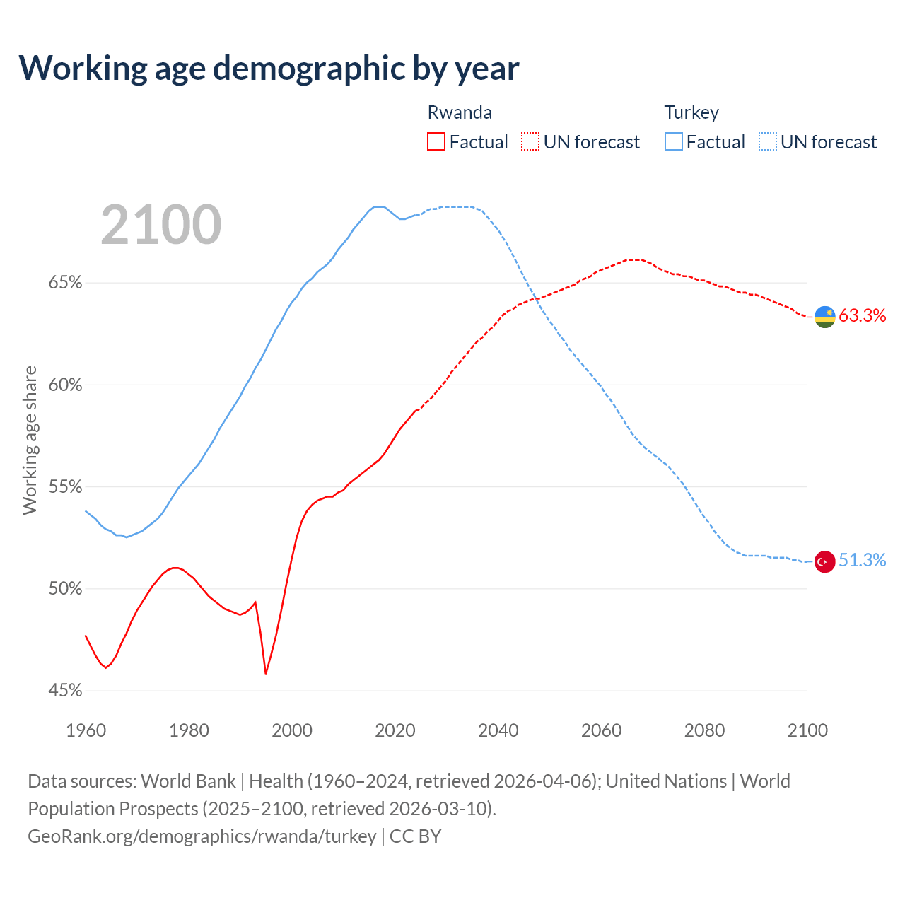 Median age Rwanda vs Turkey, 1960-2100