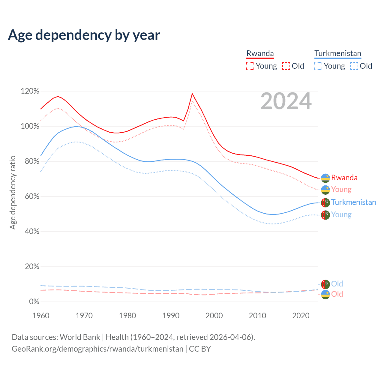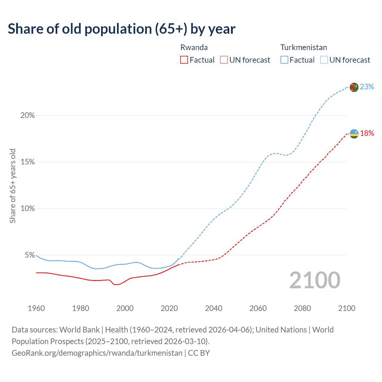 - The share of old-age demographic (65+) in Rwanda is 3.93% vs 4.53% in Turkmenistan.
