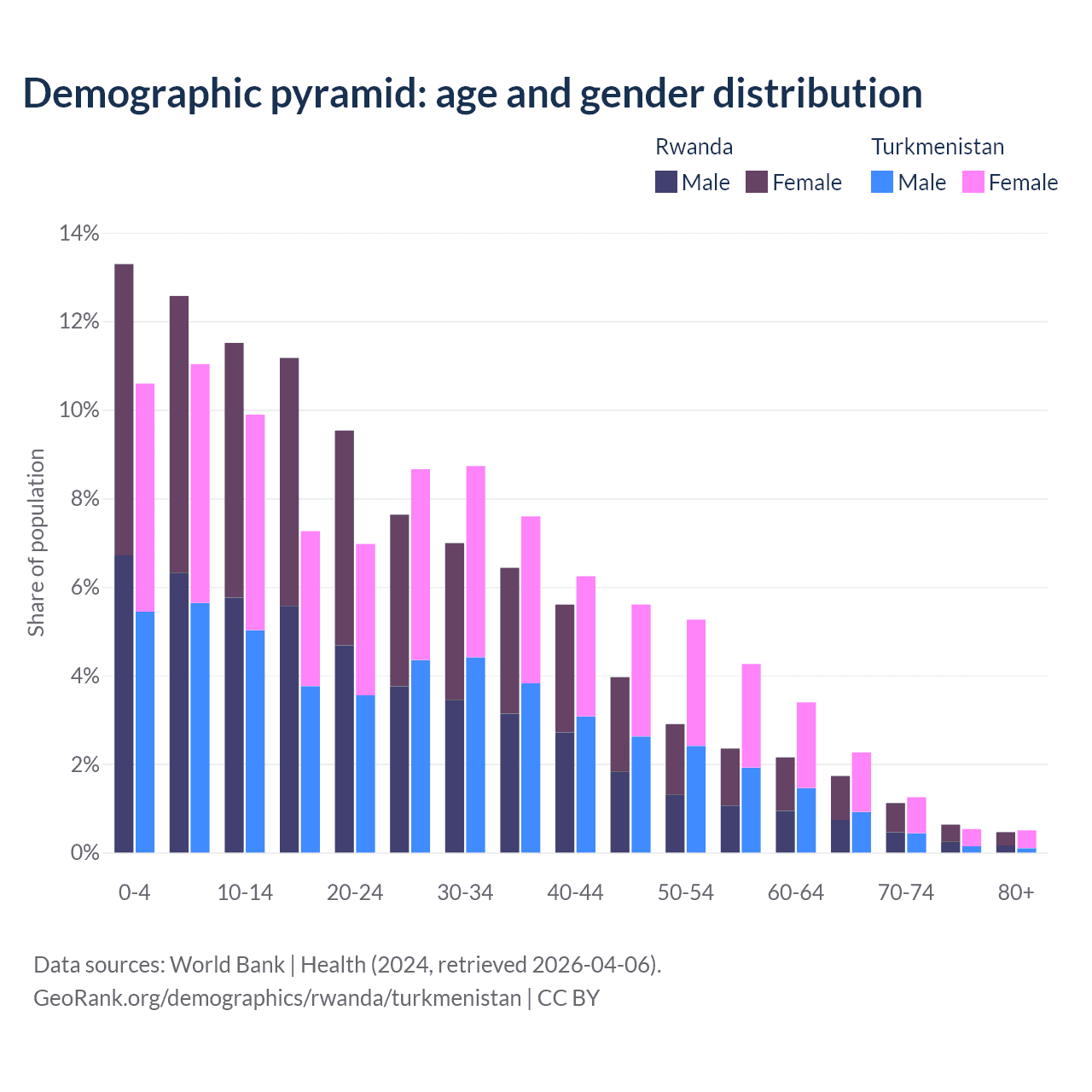 - As of 2026, the population of Rwanda is 15M vs 7.78M in Turkmenistan - 1.93 times difference.