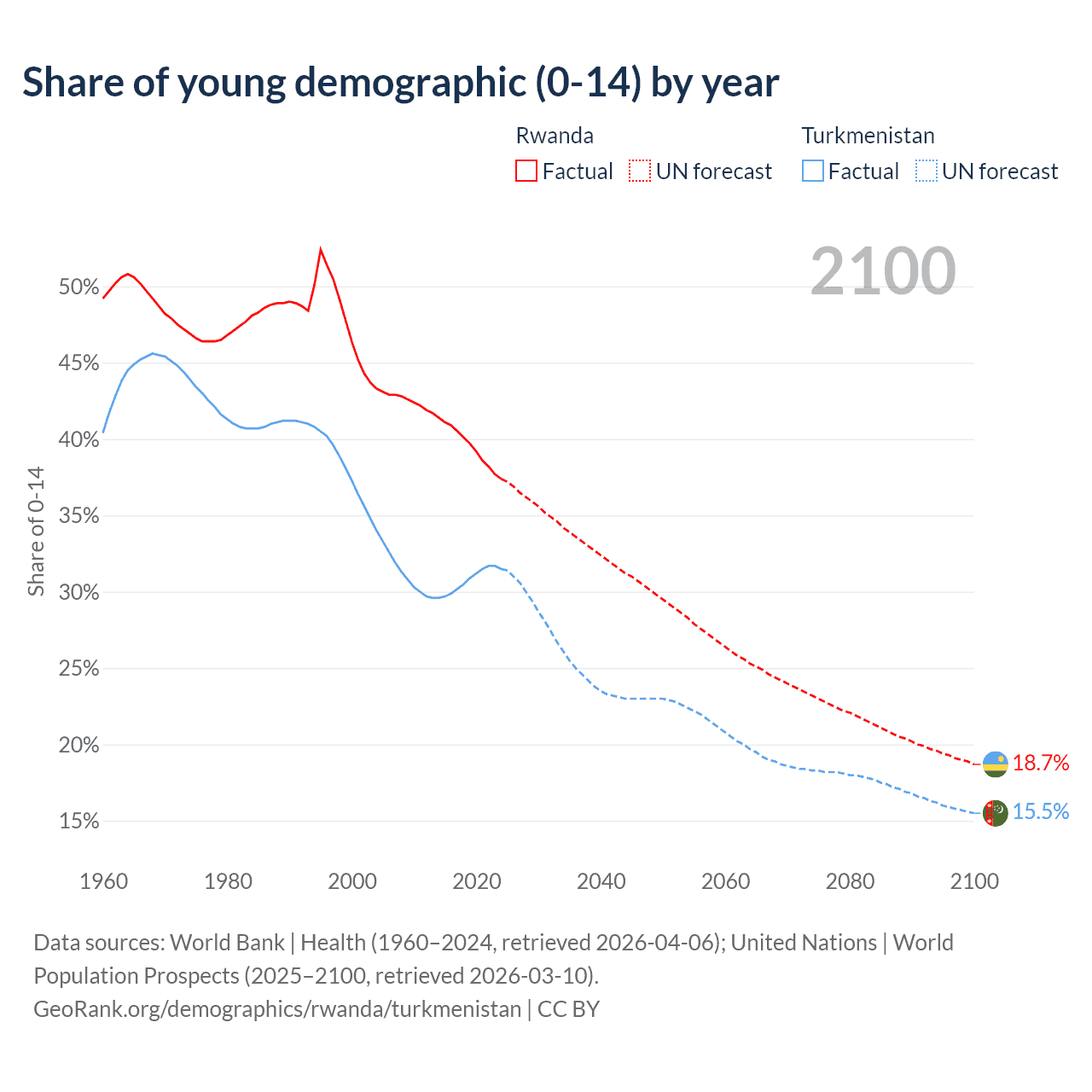 - The share of young demographic (0-15 years old) in Rwanda is 37.4% vs 31.5% in Turkmenistan.