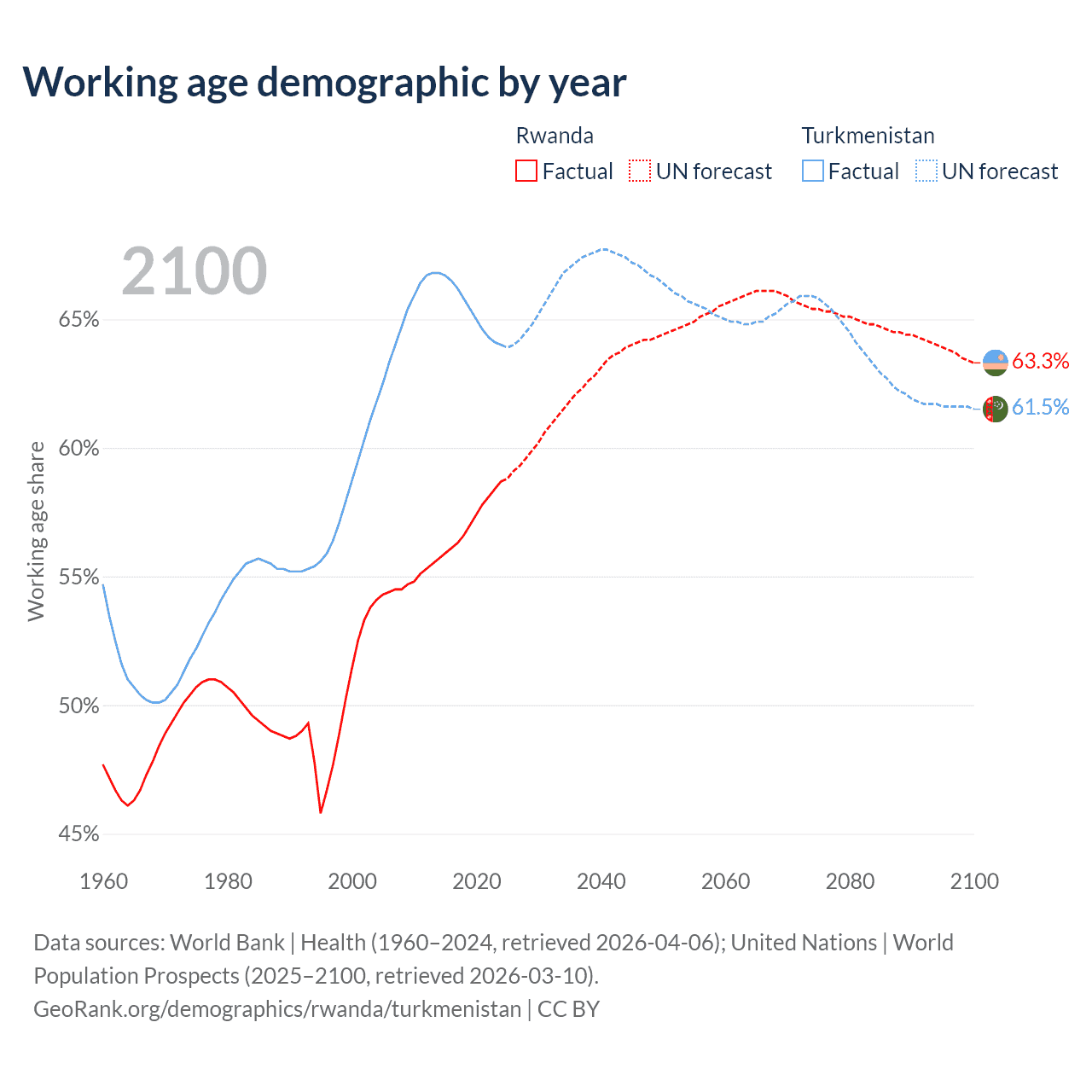 - Rwanda has 8.79M working age adults (aged 15-64) vs 4.97M in Turkmenistan.