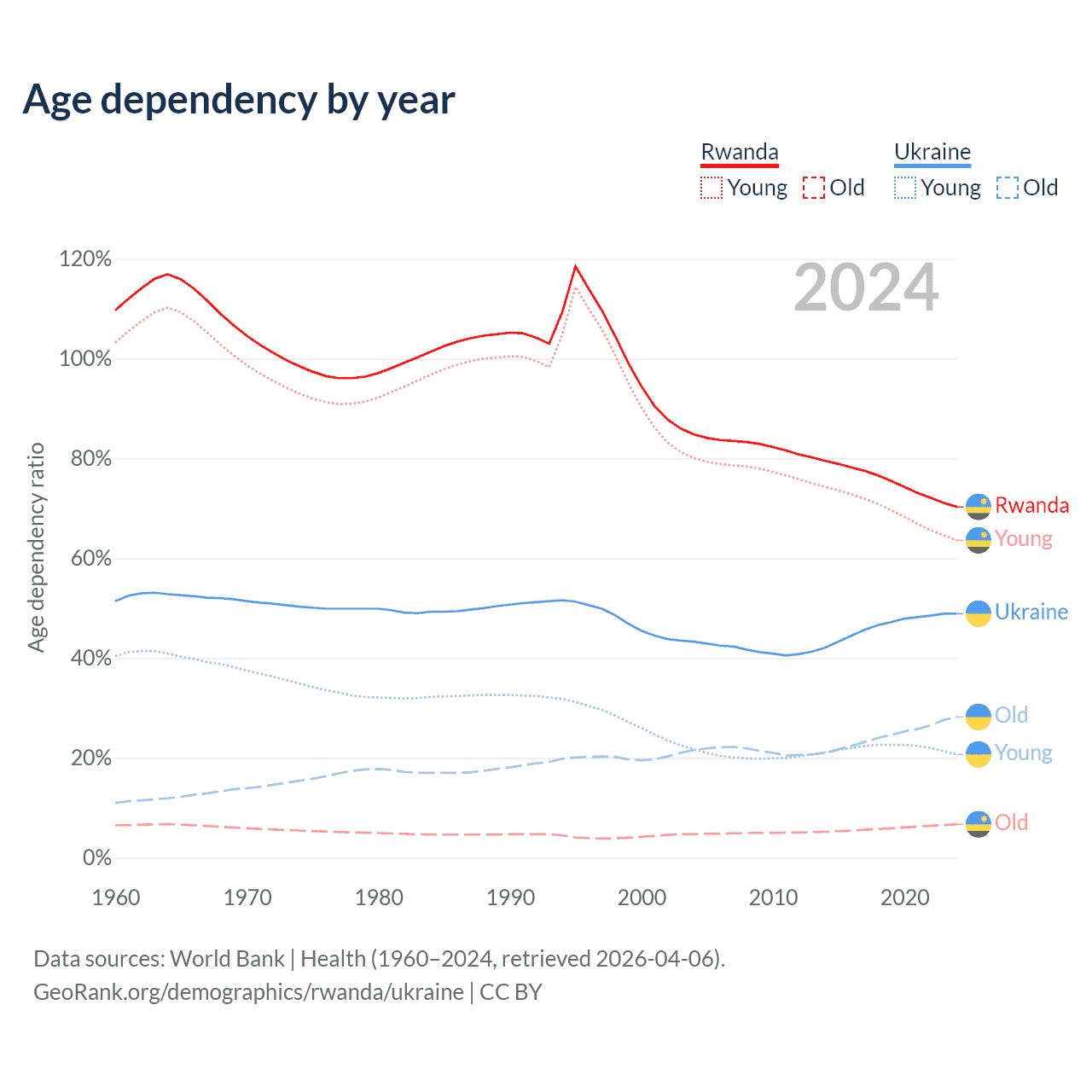 The share of older people aged 65 and over is 3.93% in Rwanda and 19% in Ukraine. Life expectancy in Rwanda compared to Ukraine .