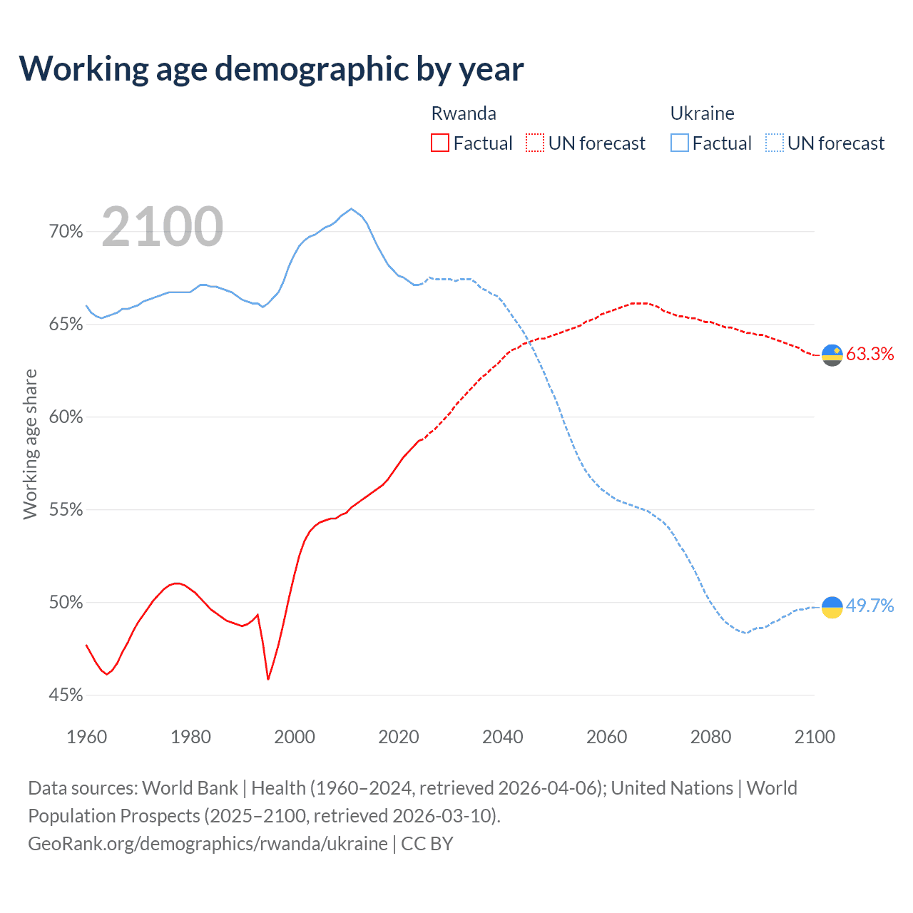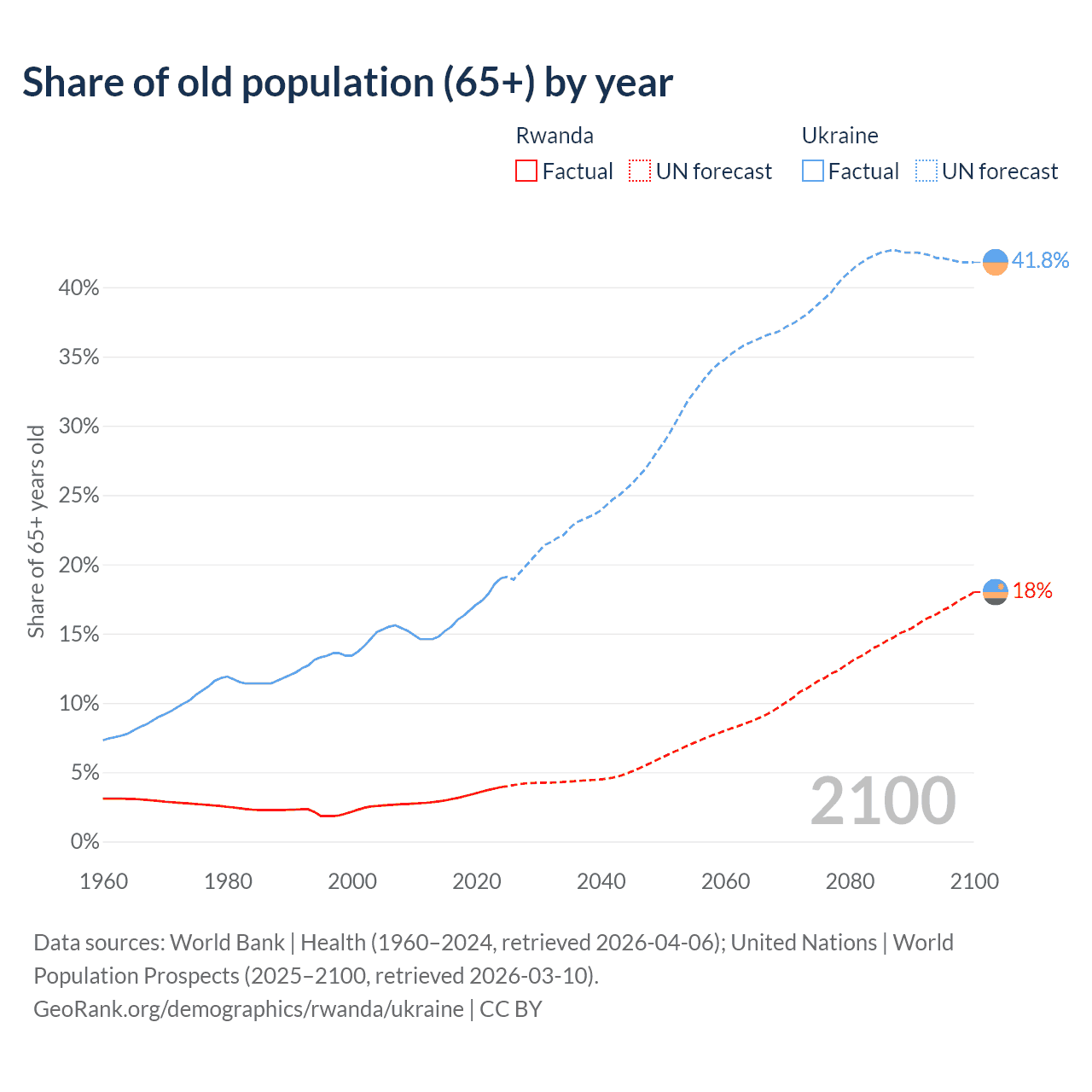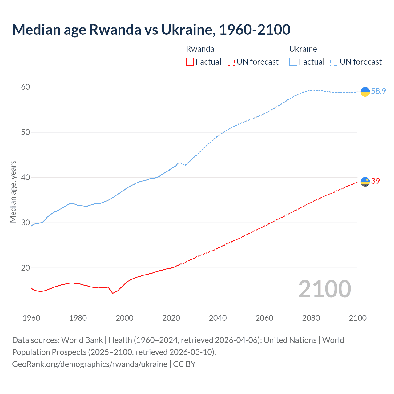 Median age Rwanda vs Ukraine, 1960-2100