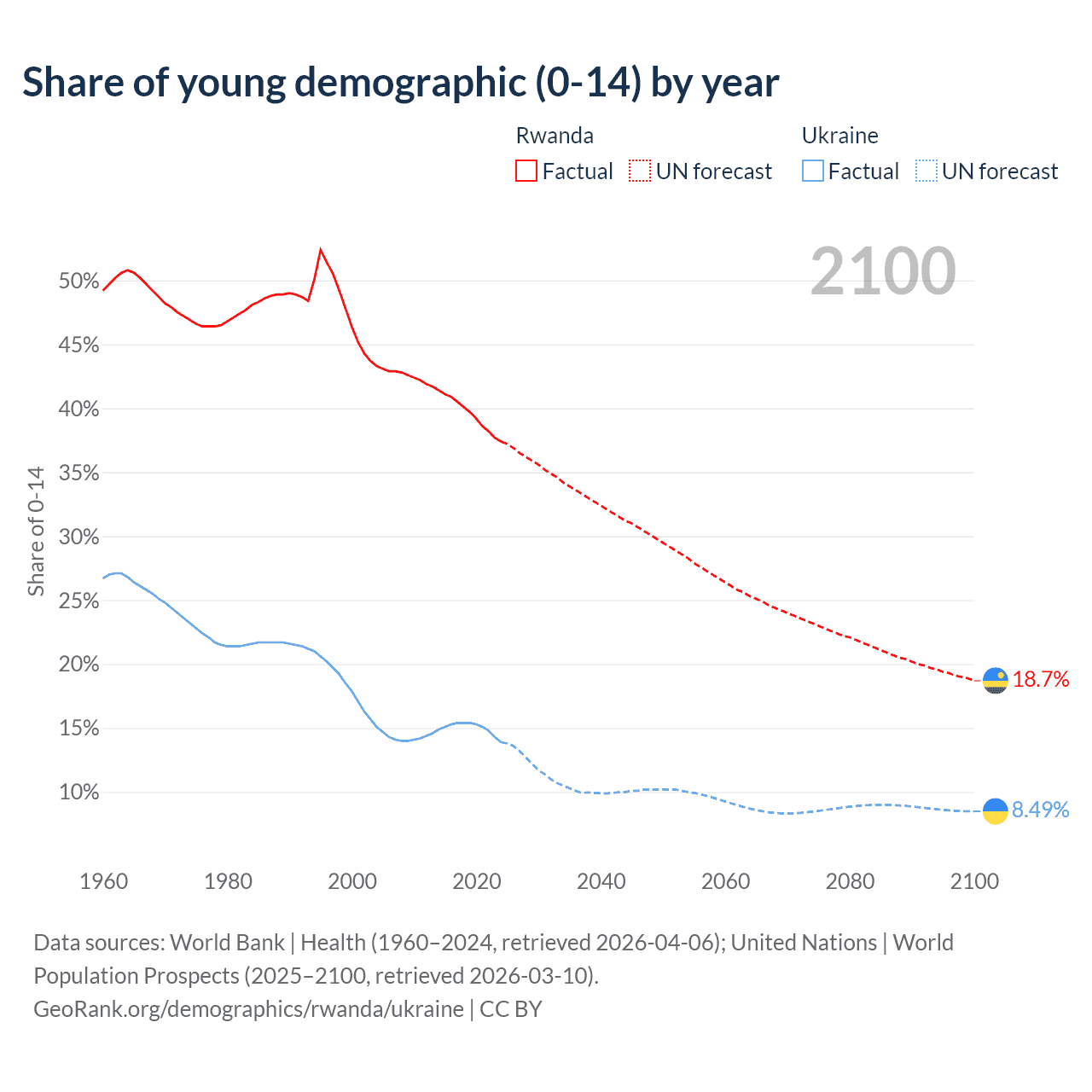 - The share of young demographic (0-15 years old) in Rwanda is 37.4% vs 13.9% in Ukraine.