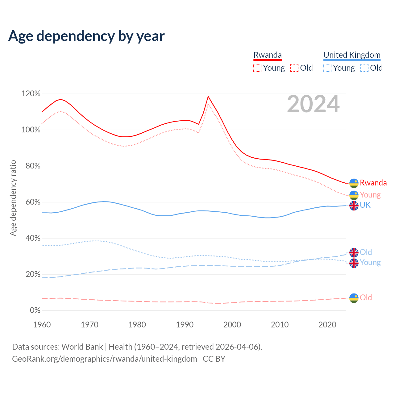 The share of older people aged 65 and over is 3.93% in Rwanda and 19.5% in the United Kingdom. Life expectancy in Rwanda compared to the United Kingdom .
