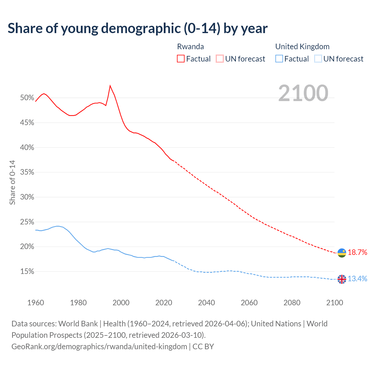 - The share of young demographic (0-15 years old) in Rwanda is 37.4% vs 17.2% in the United Kingdom.