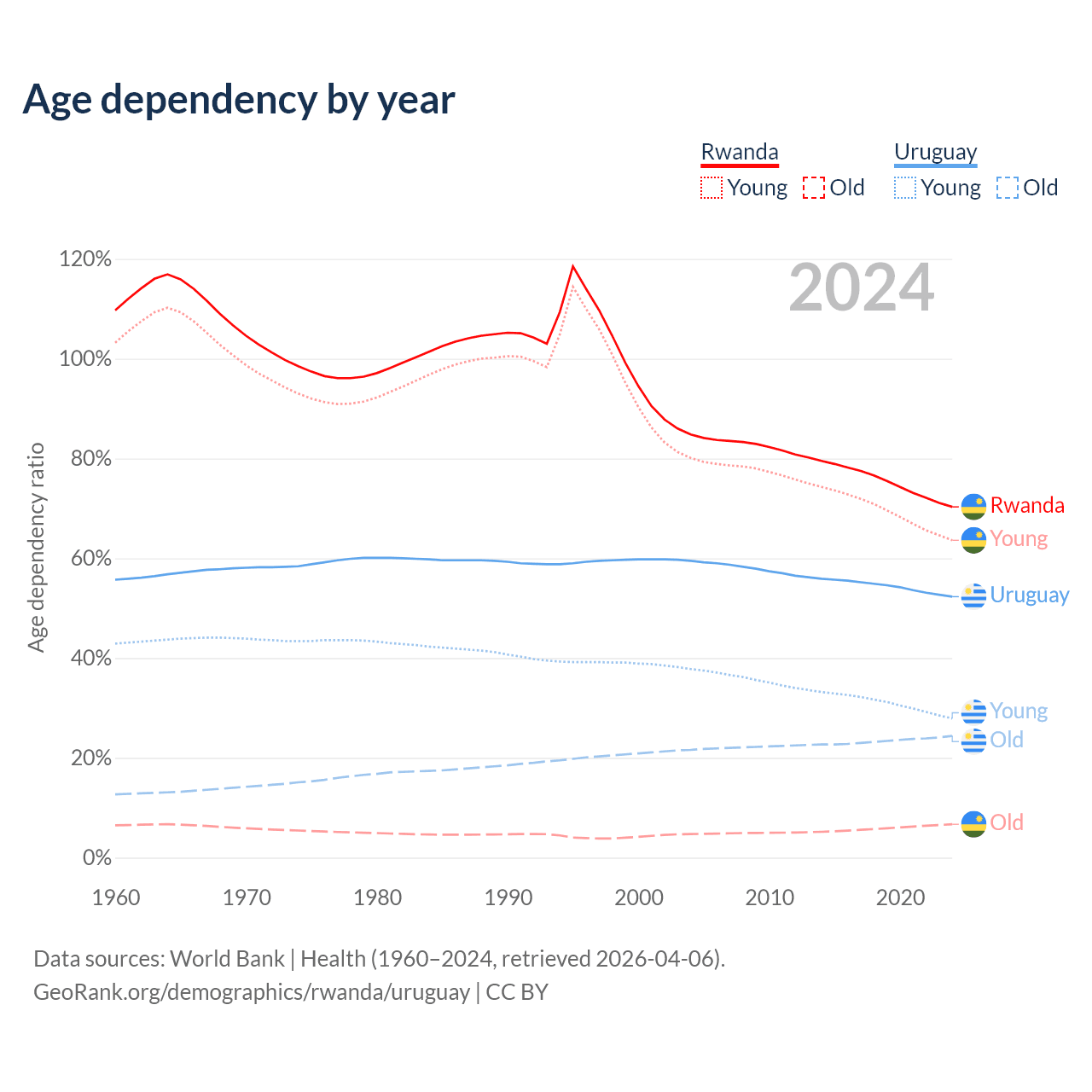 The share of older people aged 65 and over is 3.93% in Rwanda and 16% in Uruguay. Life expectancy in Rwanda compared to Uruguay .