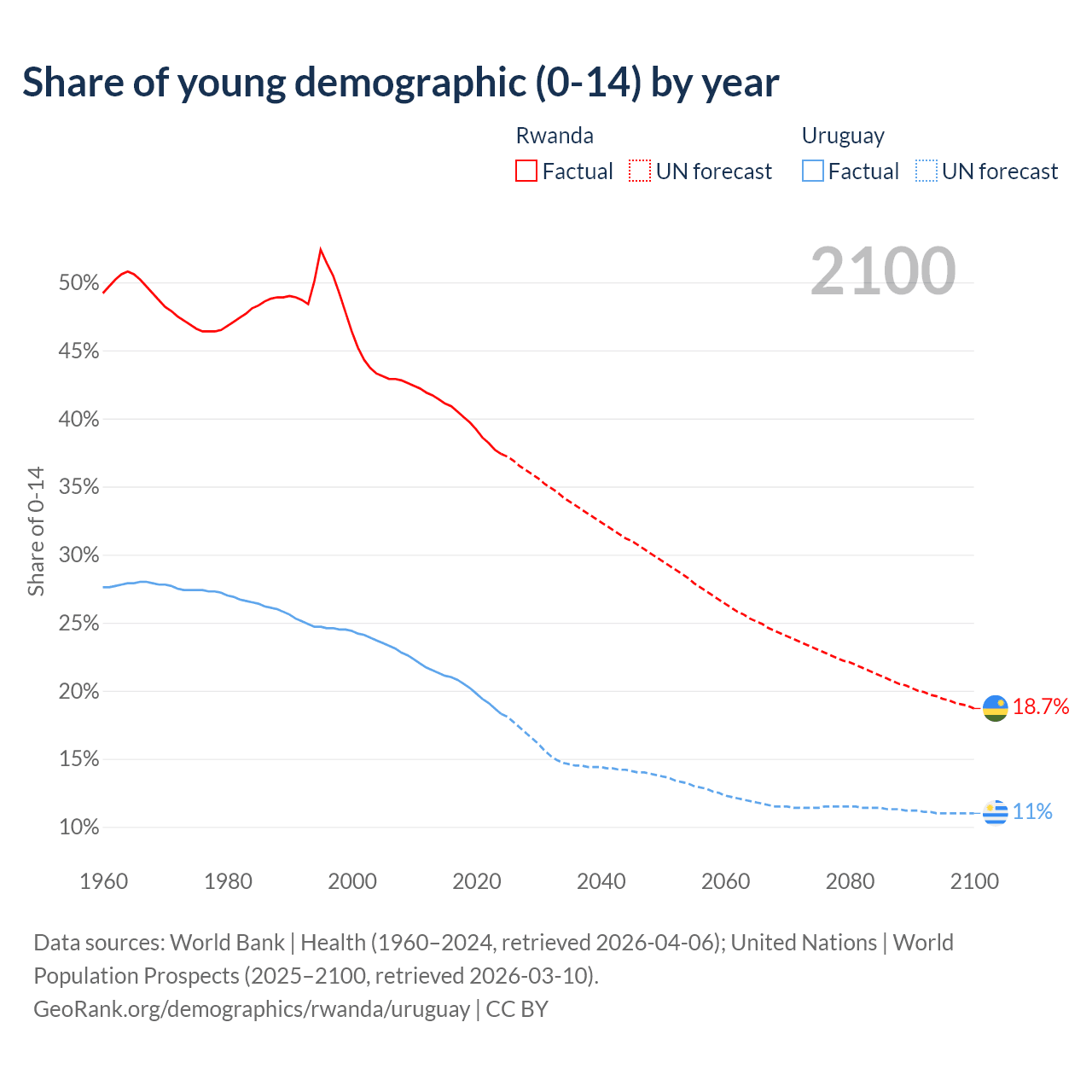 - The share of young demographic (0-15 years old) in Rwanda is 37.4% vs 18.3% in Uruguay.