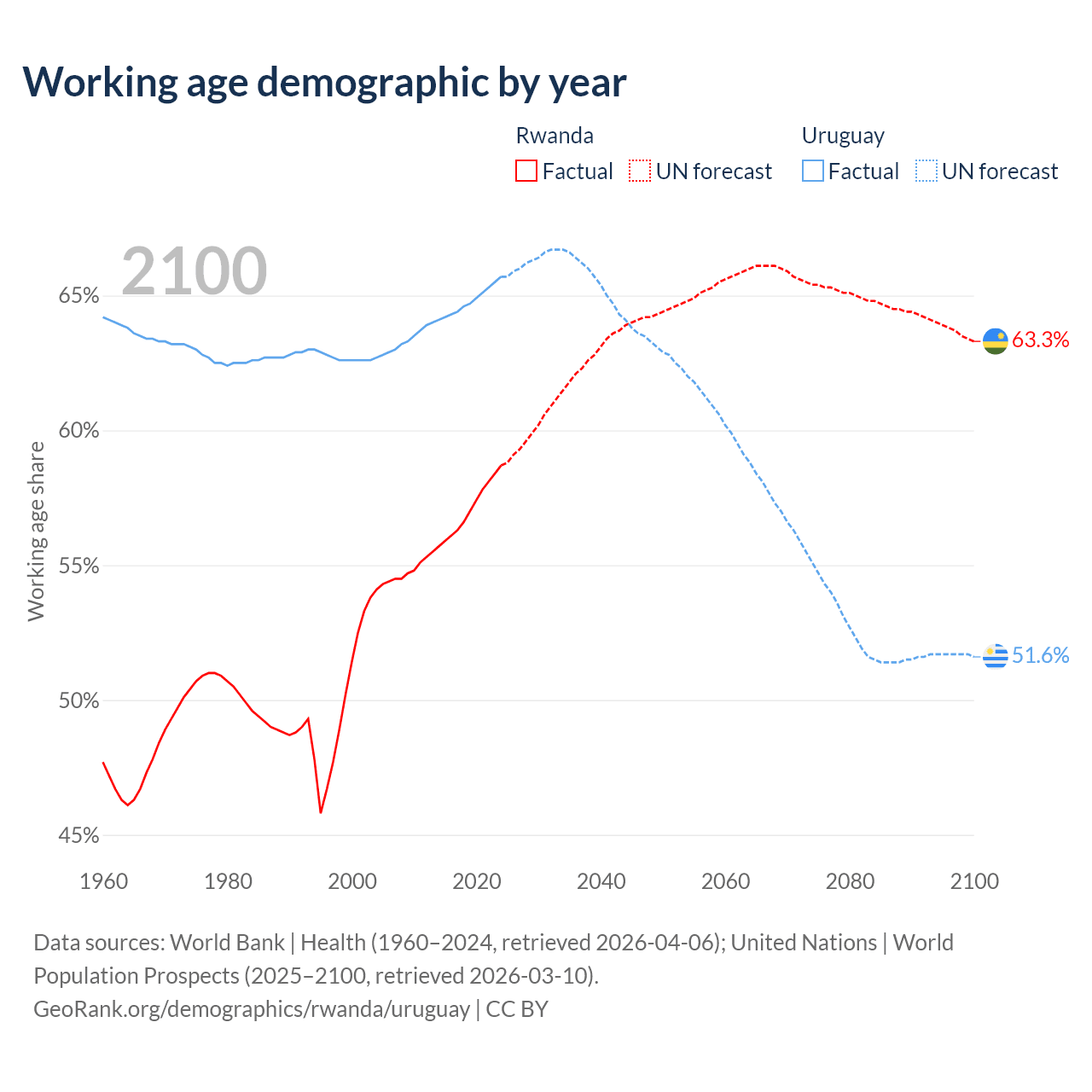 - Rwanda has 8.79M working age adults (aged 15-64) vs 2.22M in Uruguay.