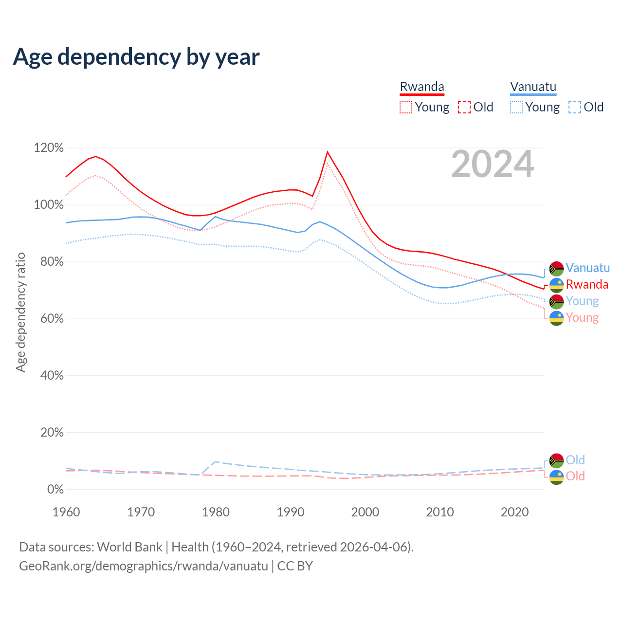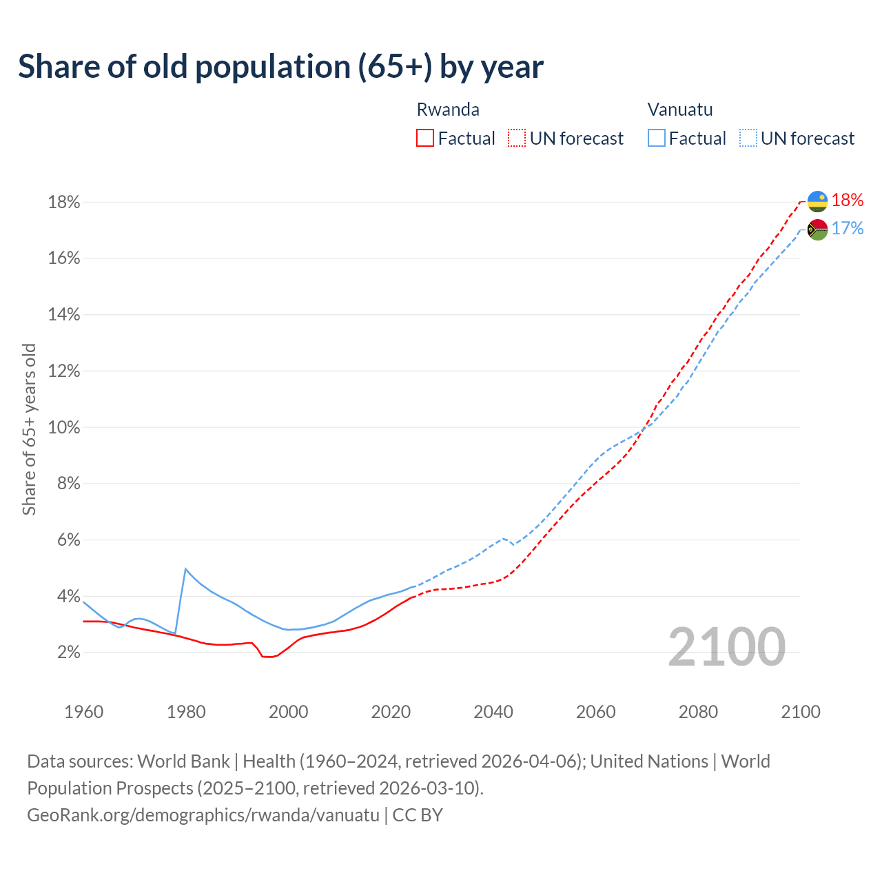- The share of old-age demographic (65+) in Rwanda is 3.93% vs 4.3% in Vanuatu.