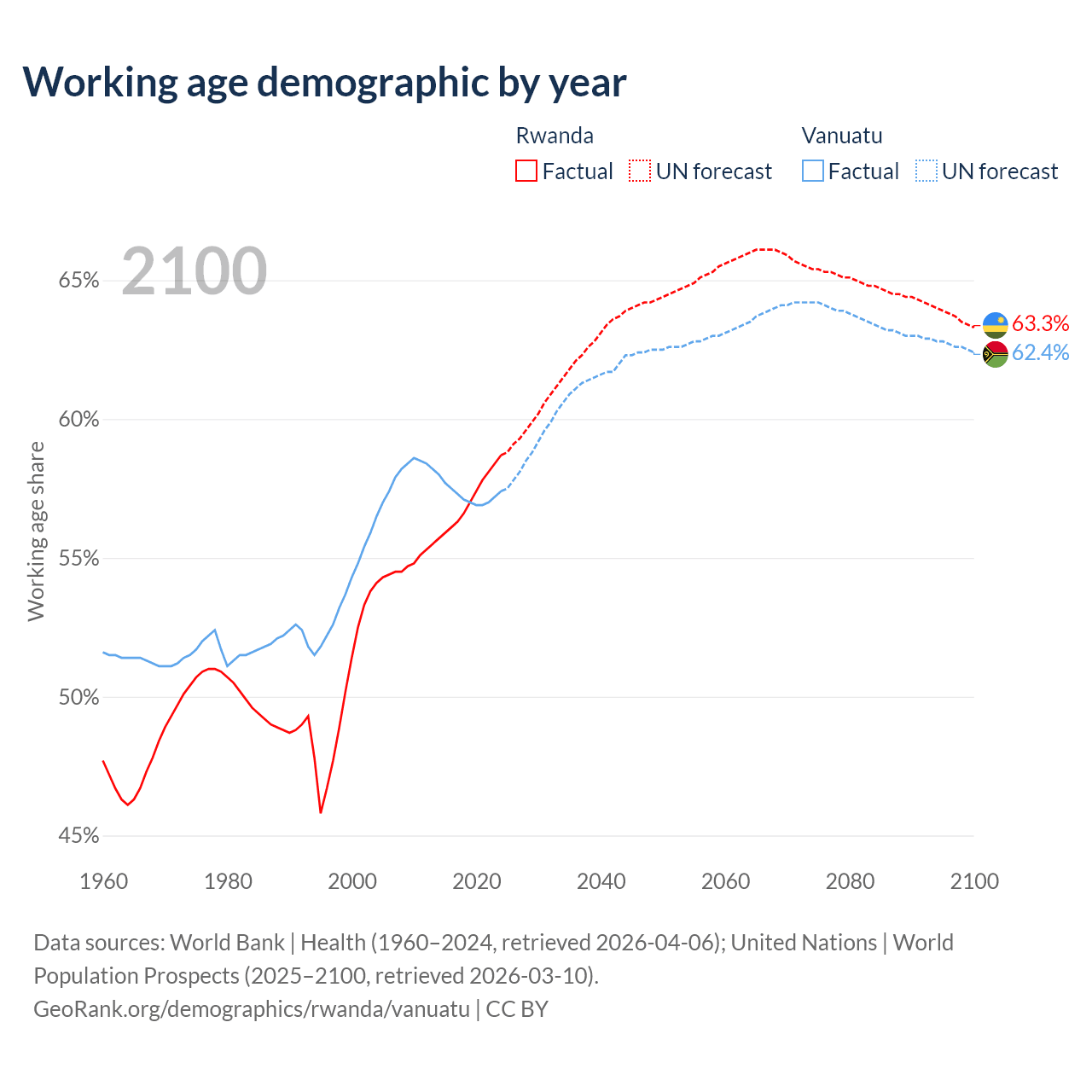 - Rwanda has 8.79M working age adults (aged 15-64) vs 198K in Vanuatu.
