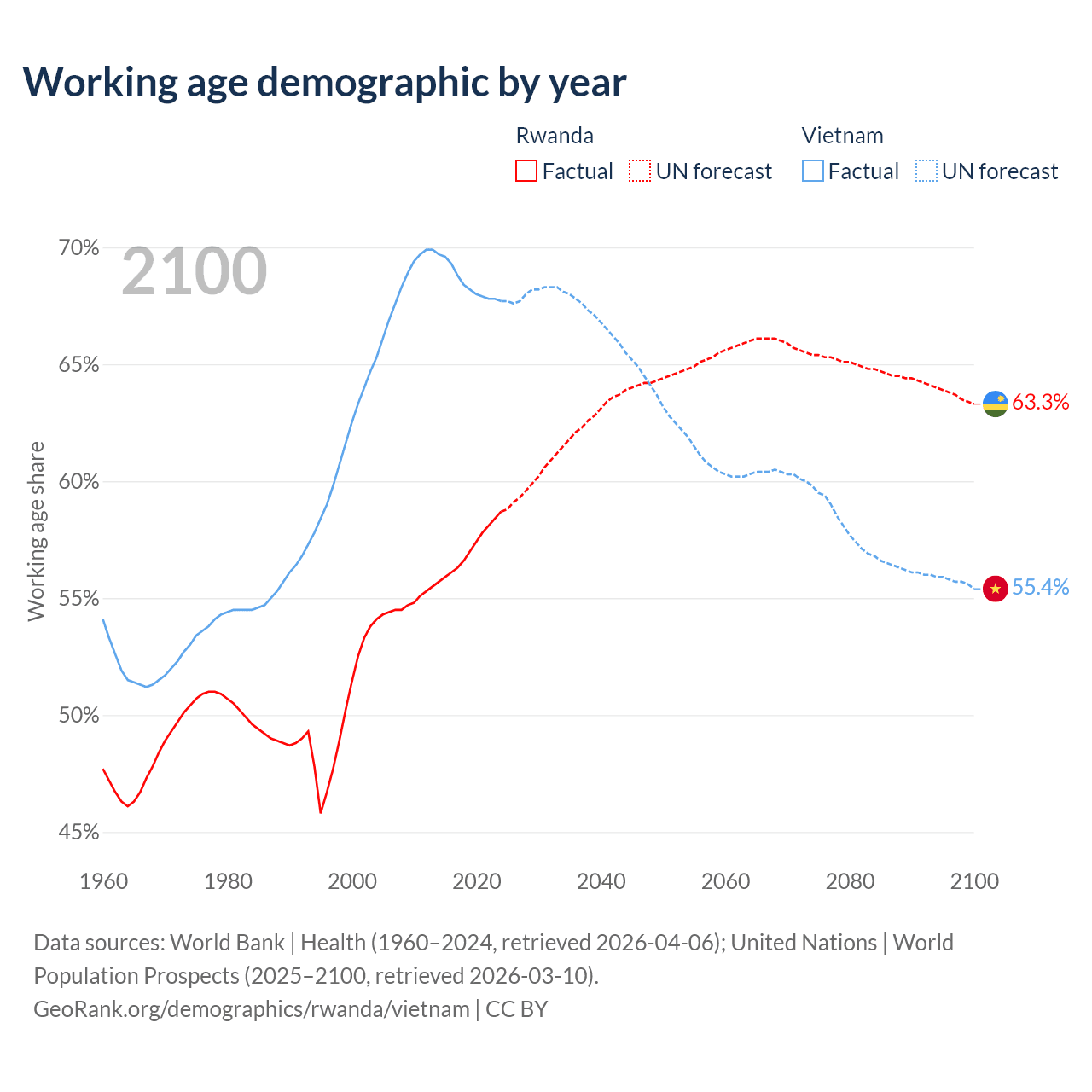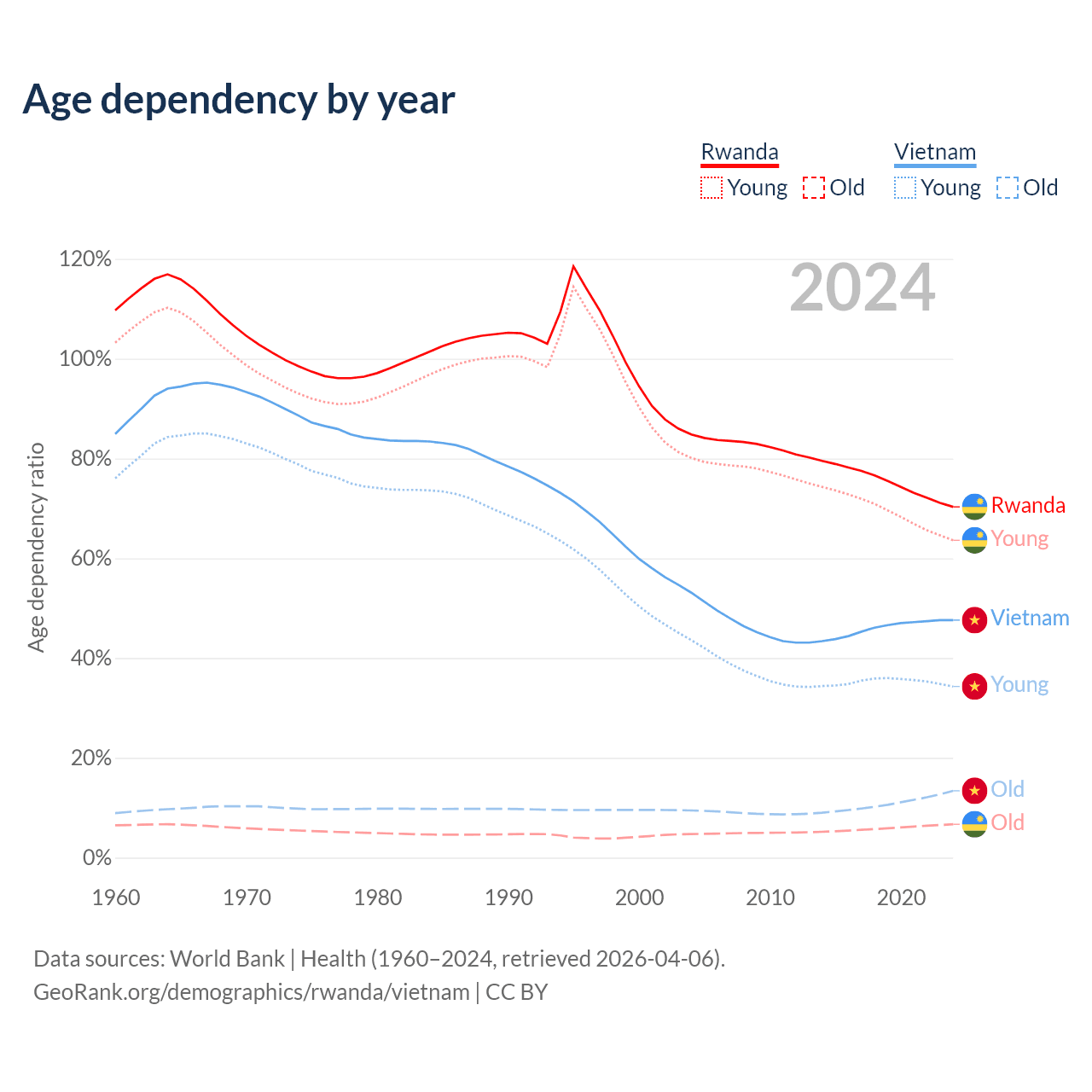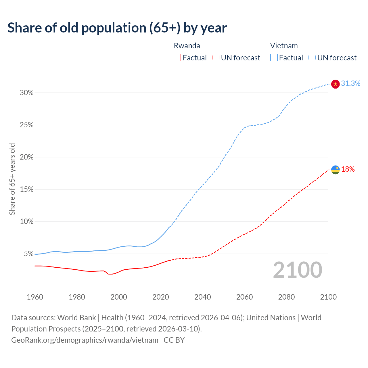 The share of older people aged 65 and over is 3.93% in Rwanda and 9.05% in Vietnam. Life expectancy in Rwanda compared to Vietnam .