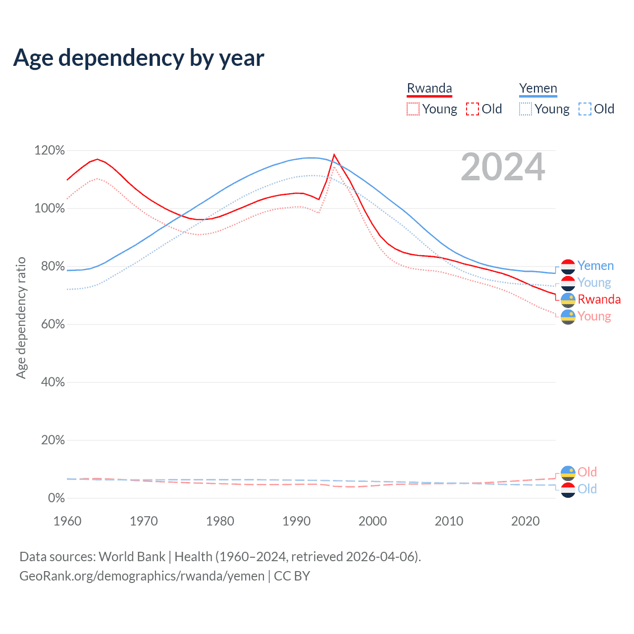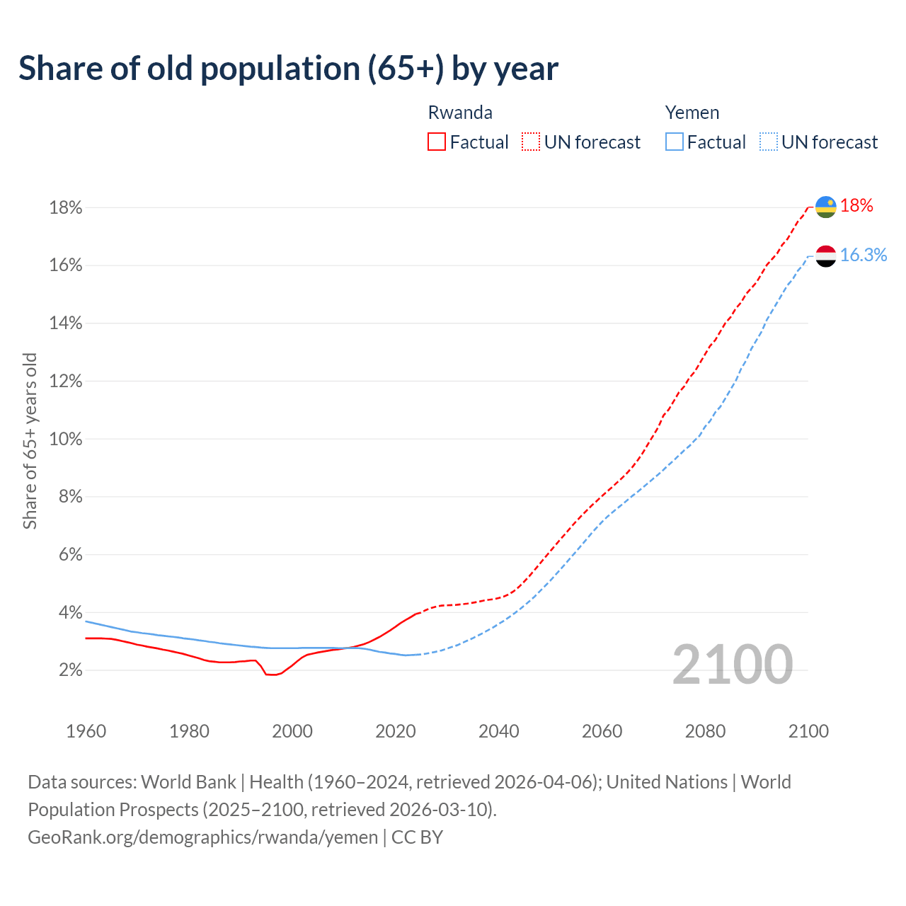 - The share of old-age demographic (65+) in Rwanda is 3.93% vs 2.52% in Yemen.