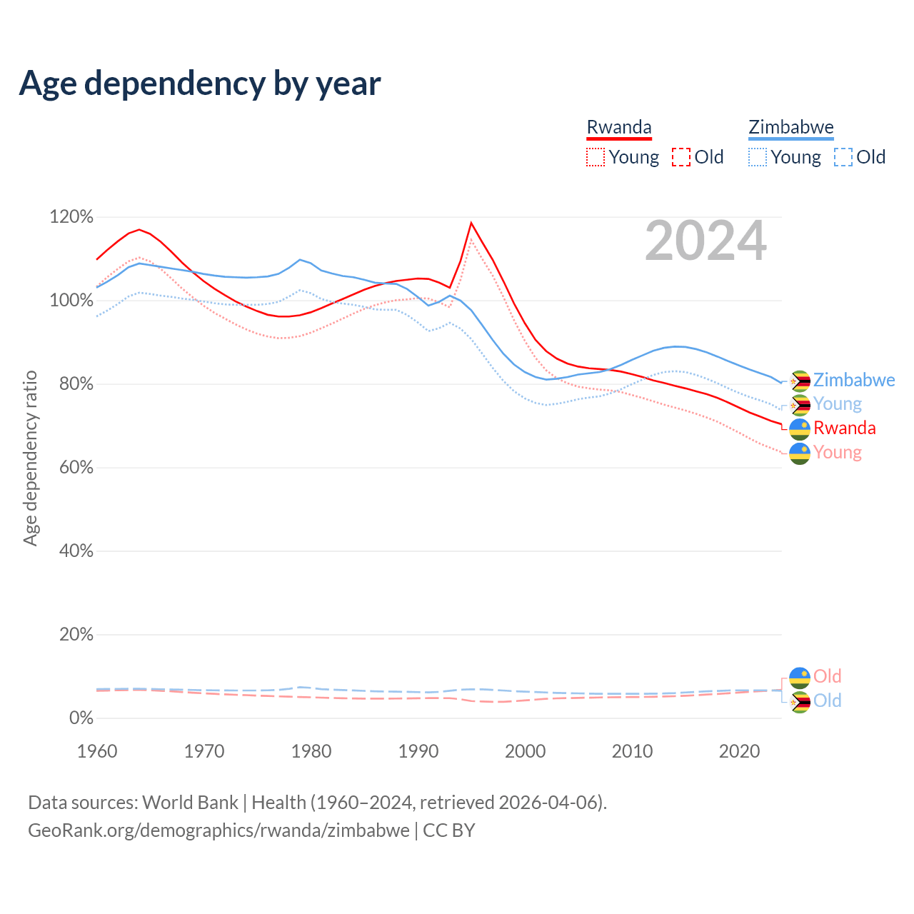 The share of older people aged 65 and over is 3.93% in Rwanda and 3.6% in Zimbabwe. Life expectancy in Rwanda compared to Zimbabwe .