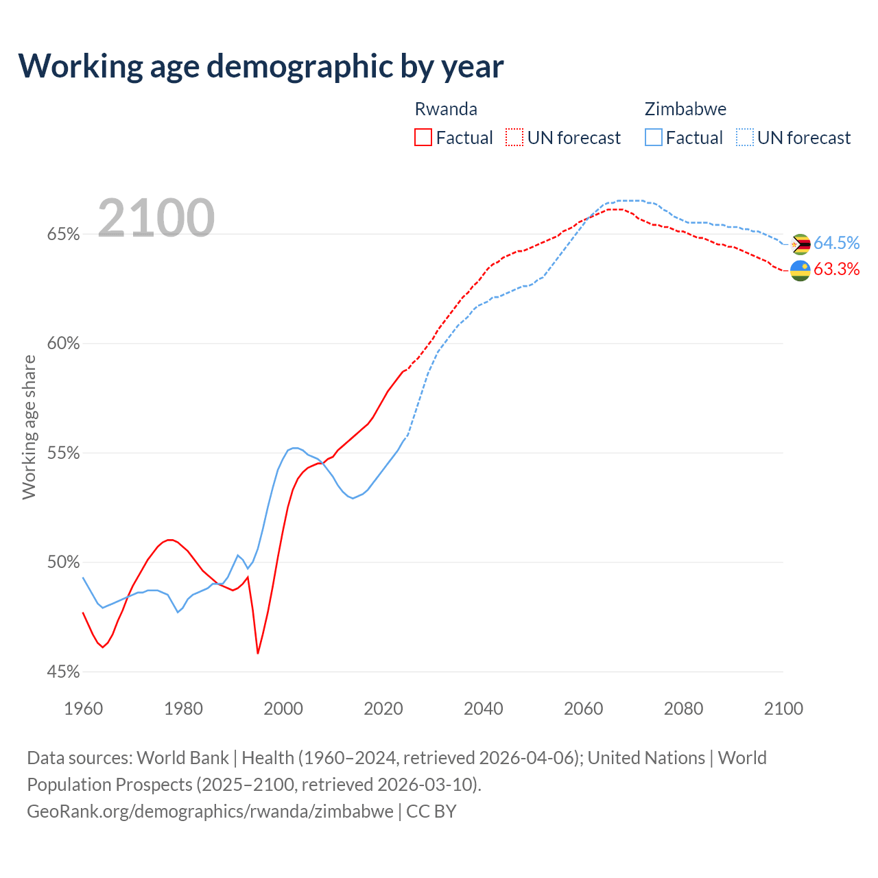 - Rwanda has 8.79M working age adults (aged 15-64) vs 9.64M in Zimbabwe.