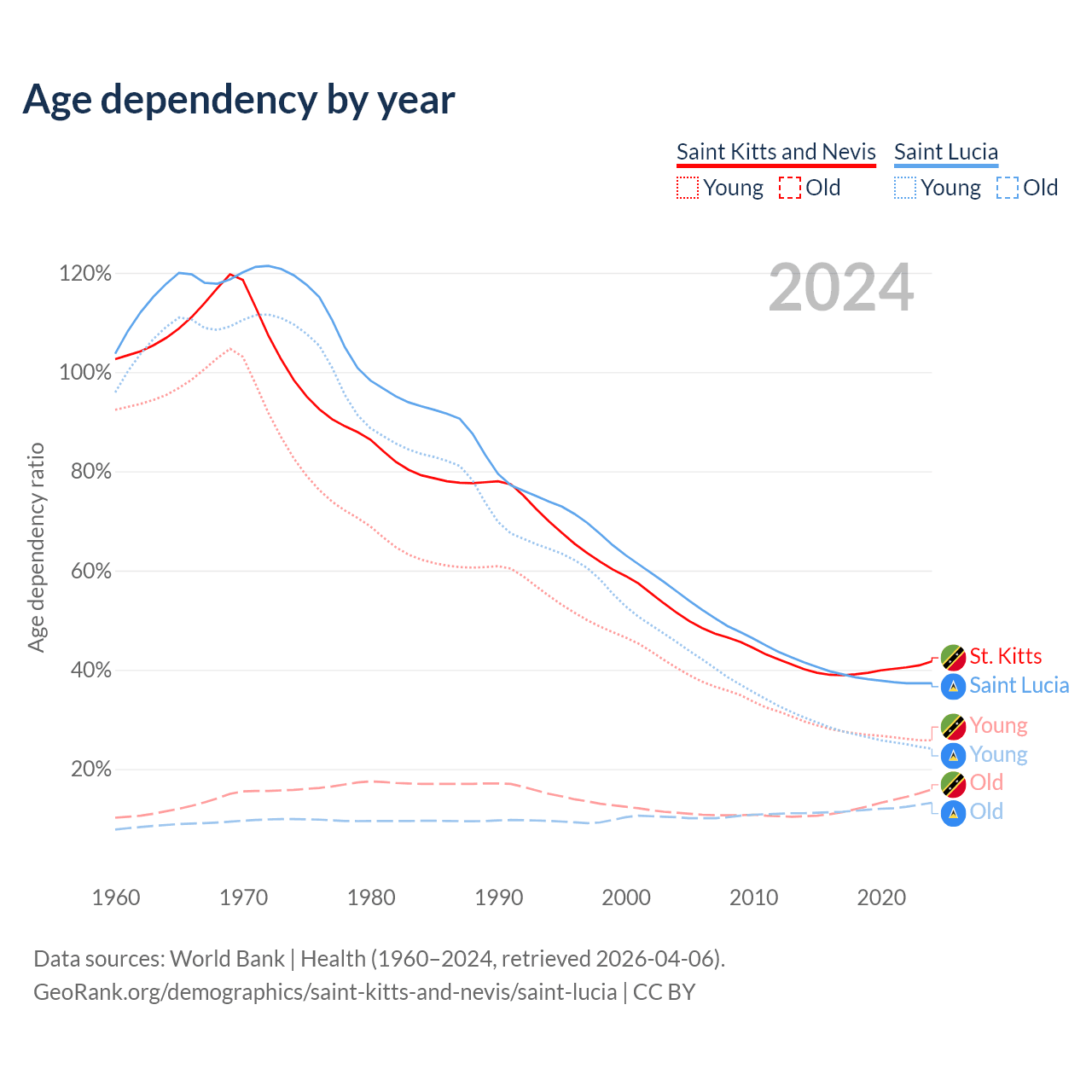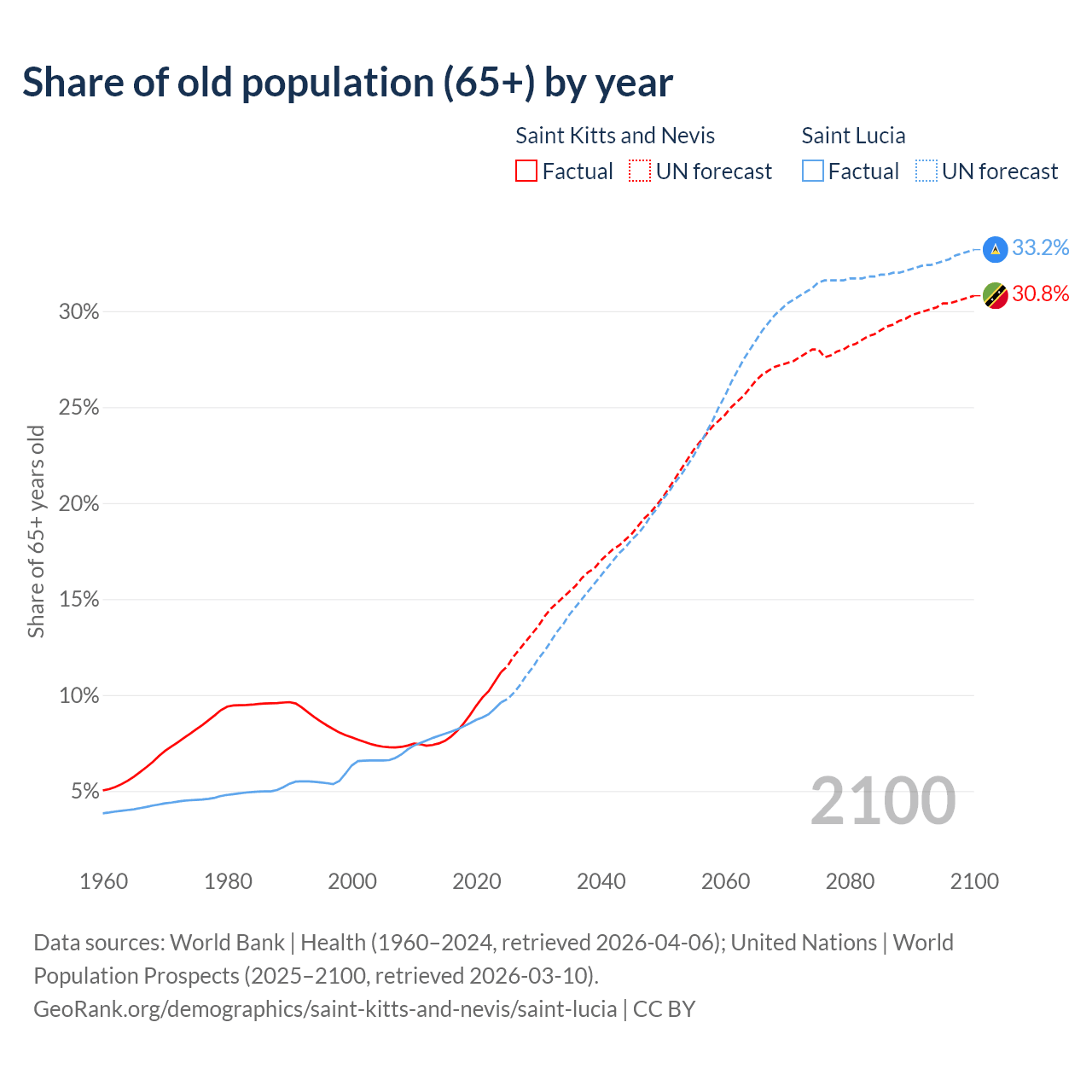 The share of older people aged 65 and over is 11.2% in Saint Kitts and Nevis and 9.62% in Saint Lucia. Life expectancy in Saint Kitts and Nevis compared to Saint Lucia .