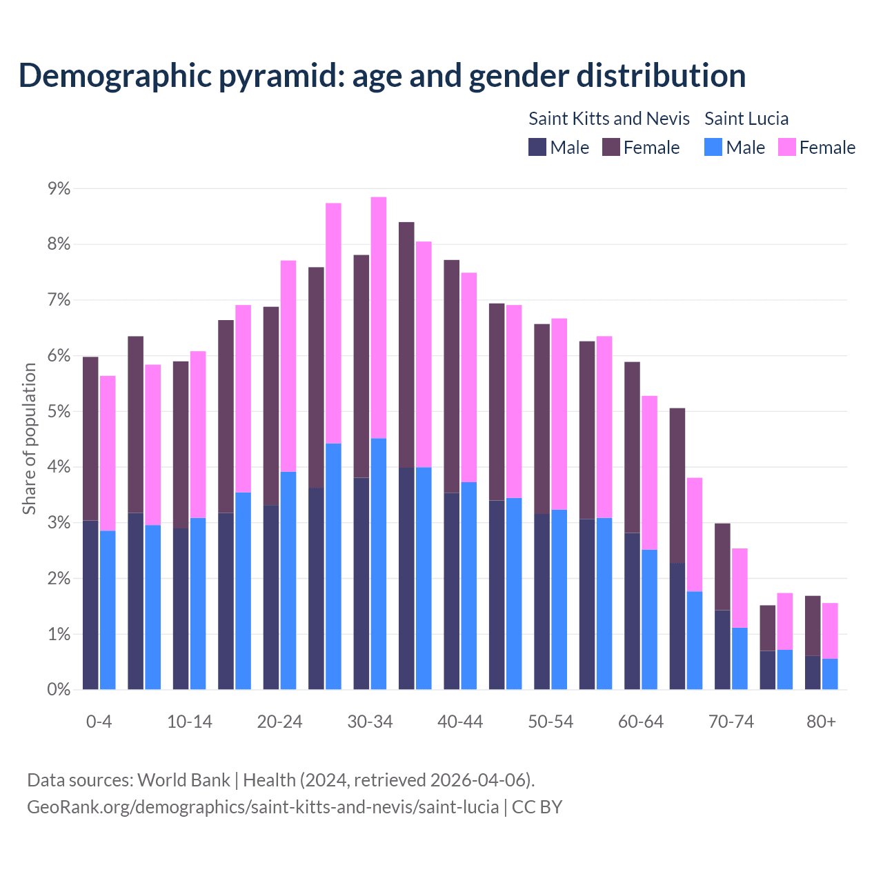 - Saint Kitts and Nevis is ranked 69/196 by median age (oldest to youngest) vs 74/196 for Saint Lucia.