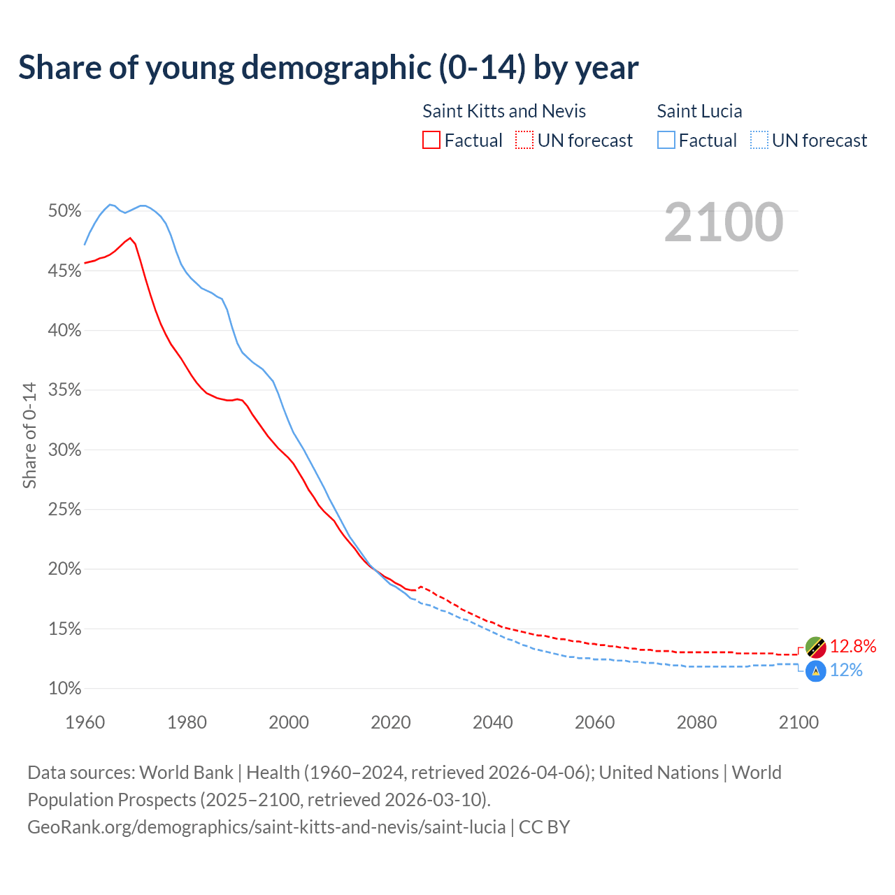 - The share of young demographic (0-15 years old) in Saint Kitts and Nevis is 18.2% vs 17.5% in Saint Lucia.