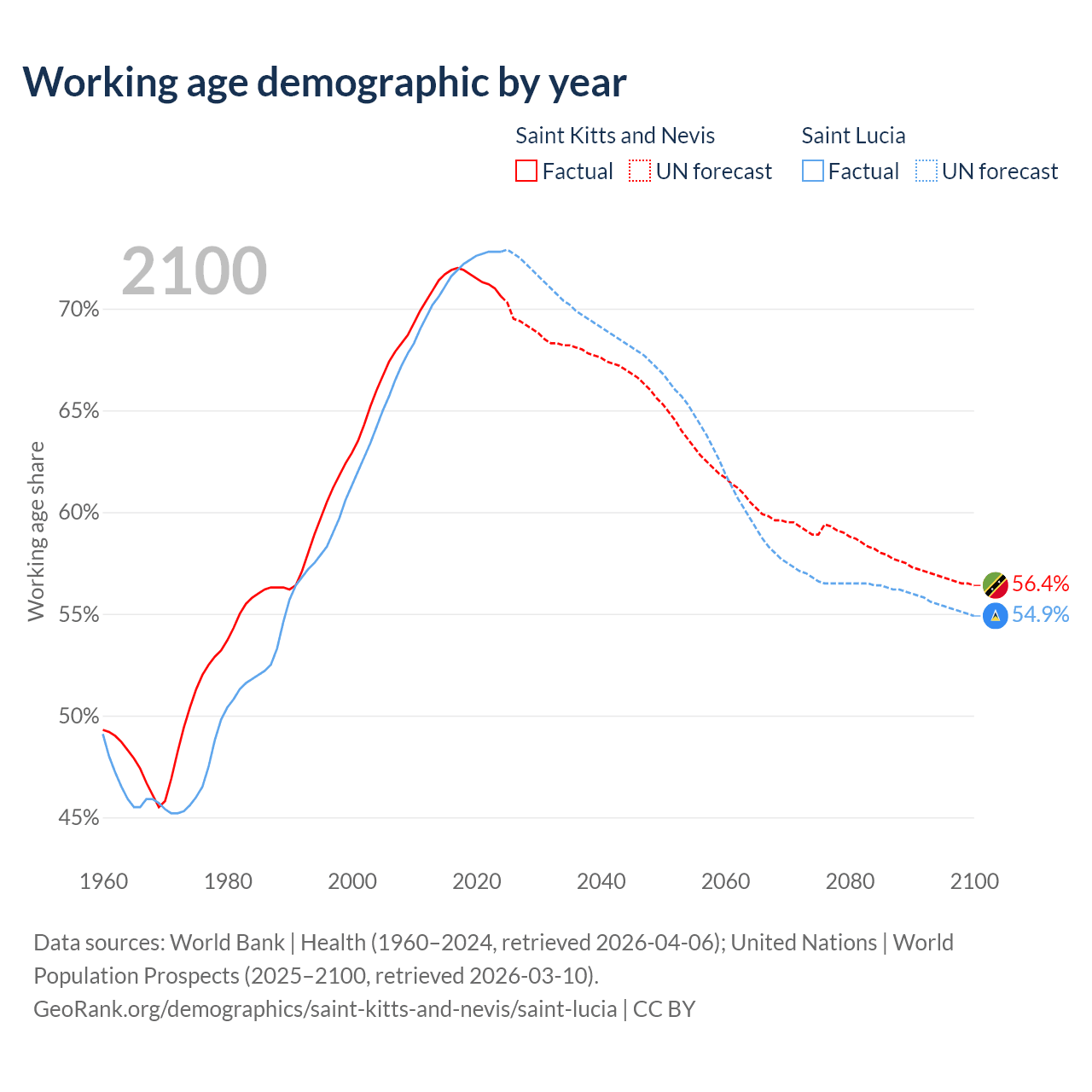 - Saint Kitts and Nevis has 33.2K working age adults (aged 15-64) vs 132K in Saint Lucia.