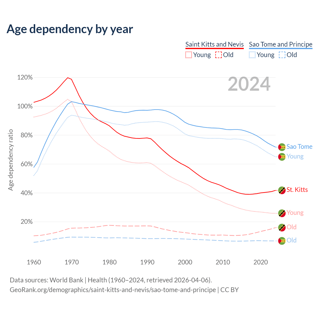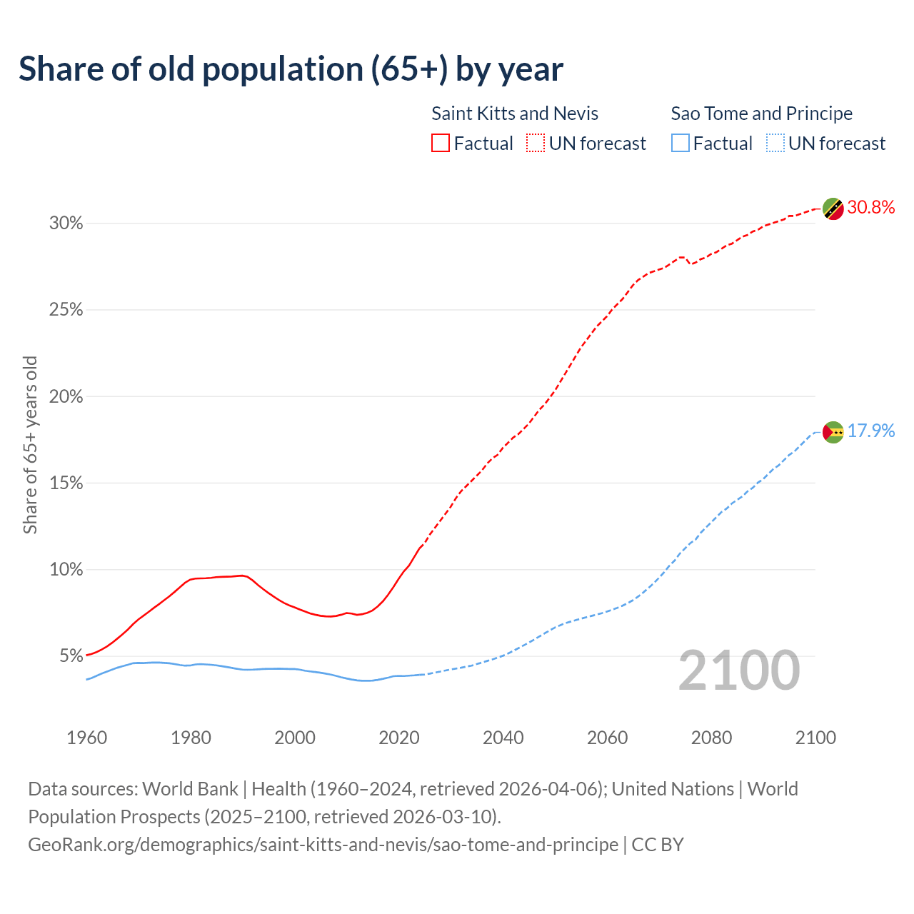 - The share of old-age demographic (65+) in Saint Kitts and Nevis is 11.2% vs 3.9% in Sao Tome and Principe.