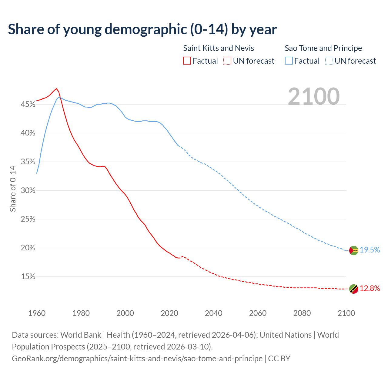 - The share of young demographic (0-15 years old) in Saint Kitts and Nevis is 18.2% vs 37.8% in Sao Tome and Principe.