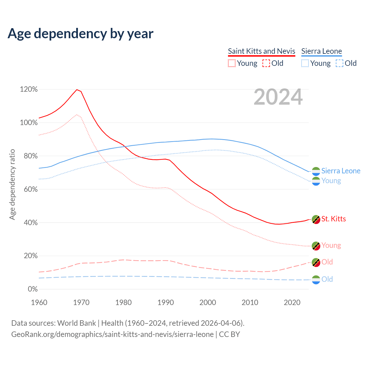 - Saint Kitts and Nevis is ranked 69/196 by median age (oldest to youngest) vs 161/196 for Sierra Leone.